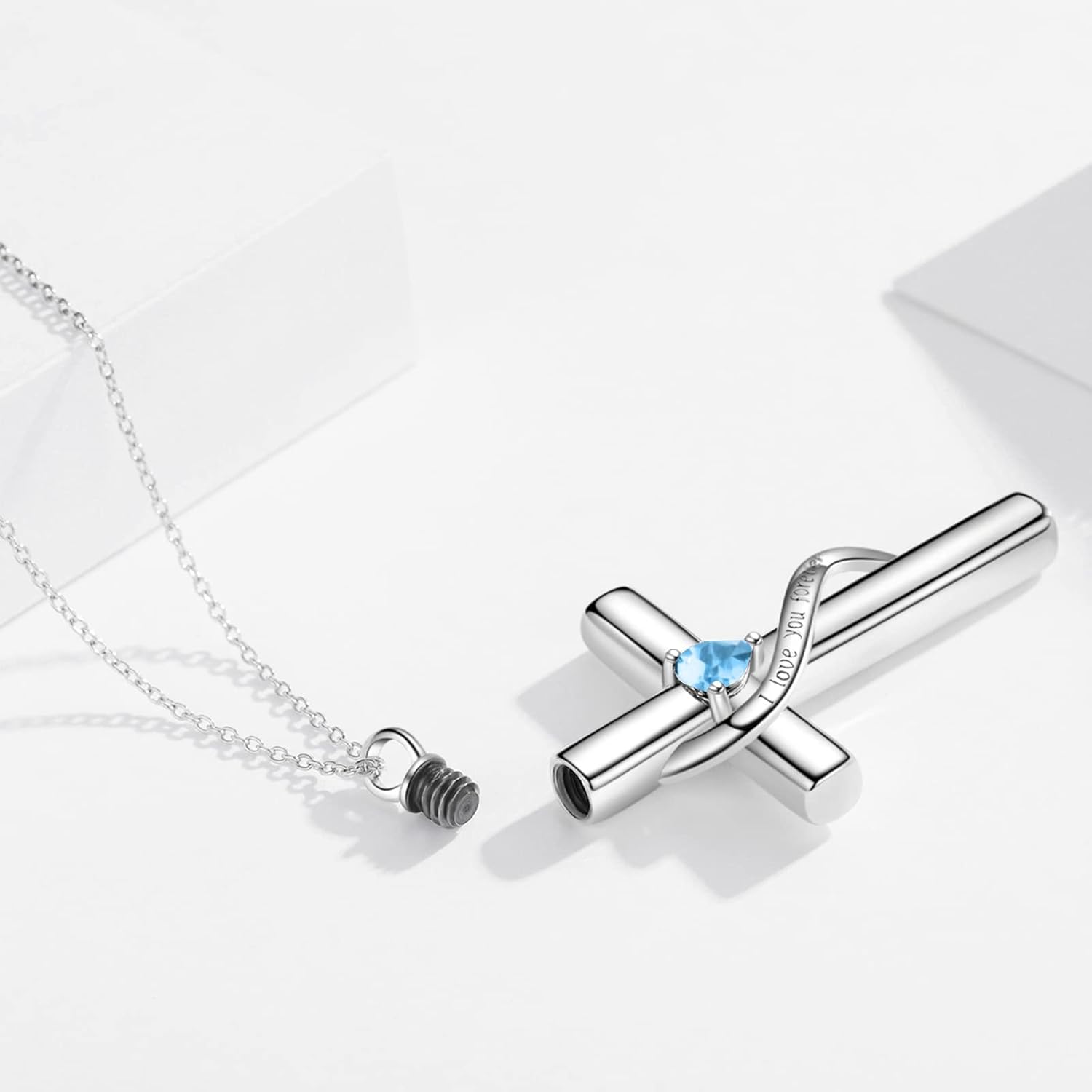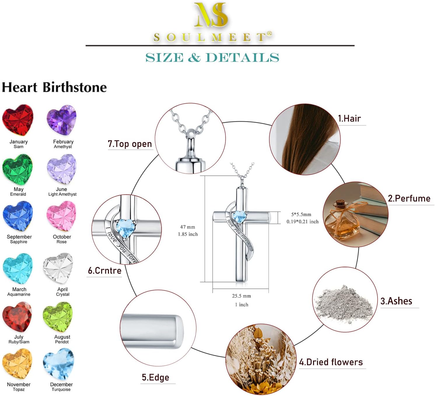 SOULMEET Crystal Cross Necklace for Ashes, Sterling Silver I Love You Forever Birthstone Cross Urn Necklaces for Ashes Keepsake Cremation Jewelry for Pet Human Ashes