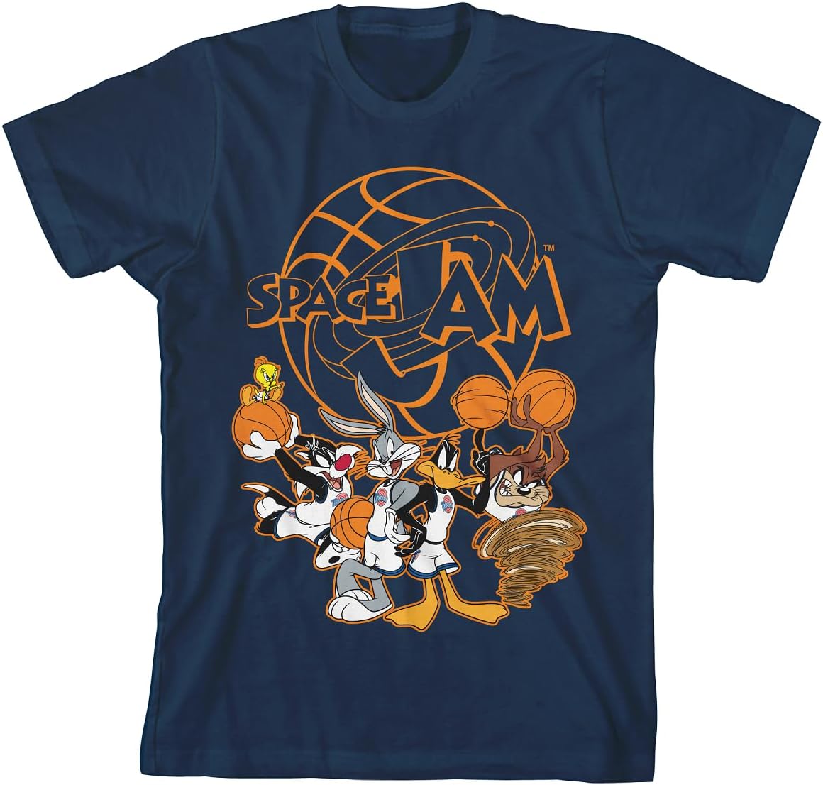 Get ready for an out-of-this-world adventure with this Space Jam youth 3-pack of t-shirts. This set includes three stellar shirts in navy, athletic heather, and white, featuring custom designs inspired by the iconic Space Jam franchise. The basketball logo takes center stage on the navy tee, while the athletic heather tee features the Looney Tunes characters gathered around the Tune Squad logo. The white tee bursts with colorful panels of Bugs, Daffy, Lola, and Porky, accompanied by the phrase “Welcome to the Jam.” Made with sustainably and fairly grown USA cotton blended with polyester, these short sleeve tees offer both comfort and durability. Step up your style game and join the Jam with these officially approved t-shirts!