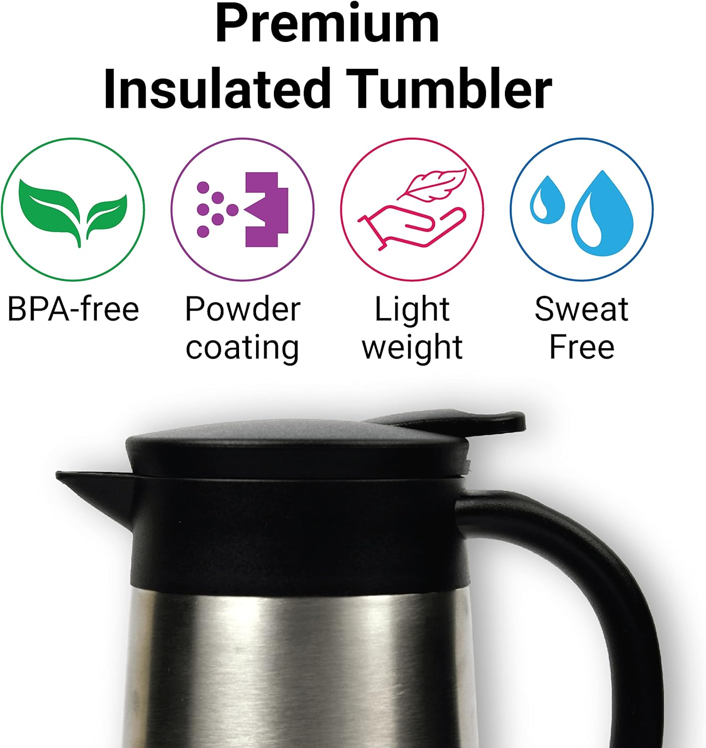 Our range of flasks are perfect to keep by your bedside or to keep your tea or coffee in to drink at your leisure. The Steel coating and vacuum insulation keeps your drink at the right temperature even in an airconditioned environment, so that whenever you pour your drink, It is just at the temperature you like it. The large mouth opening makes filling and cleaning easy. The outer body stays cool even when filled with hot liquids, and is condensation free when filled with cold beverages. Available in a classic brushed steel finish and a contemporary matte red and black, there is a Tea Pot to suit all fancies!stainless steel vacuum jug with ergonomic screw cap.Screw cap made of plastic with Santoprene seal. Full-metall jug without plastic seals. Professional version. Very good heat retention due to double-walled stainless steel insert. The model is dishwasher-safe and break-resistant.