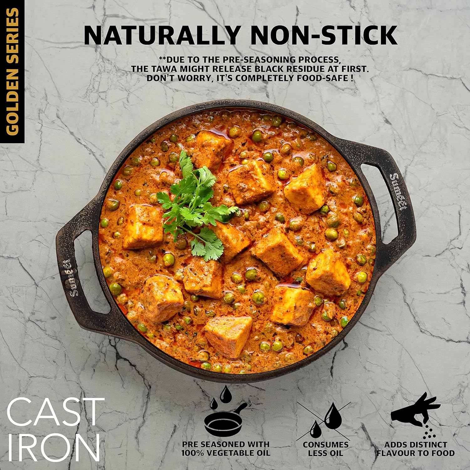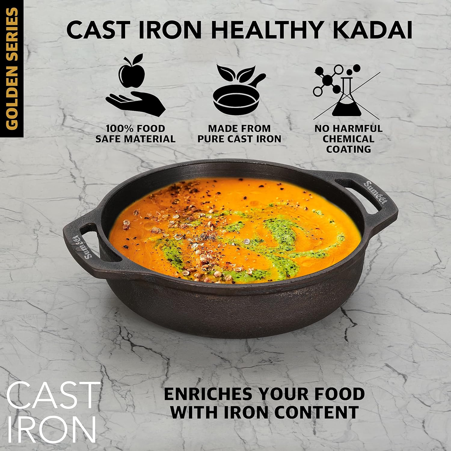 Sumeet Super Smooth Gold Series Pre Seasoned Cast Iron Kadai for Cooking/Deep Fry/Saute |2.7 LTR, 25cm, 2.670kg, Gas & Induction-Friendly.
