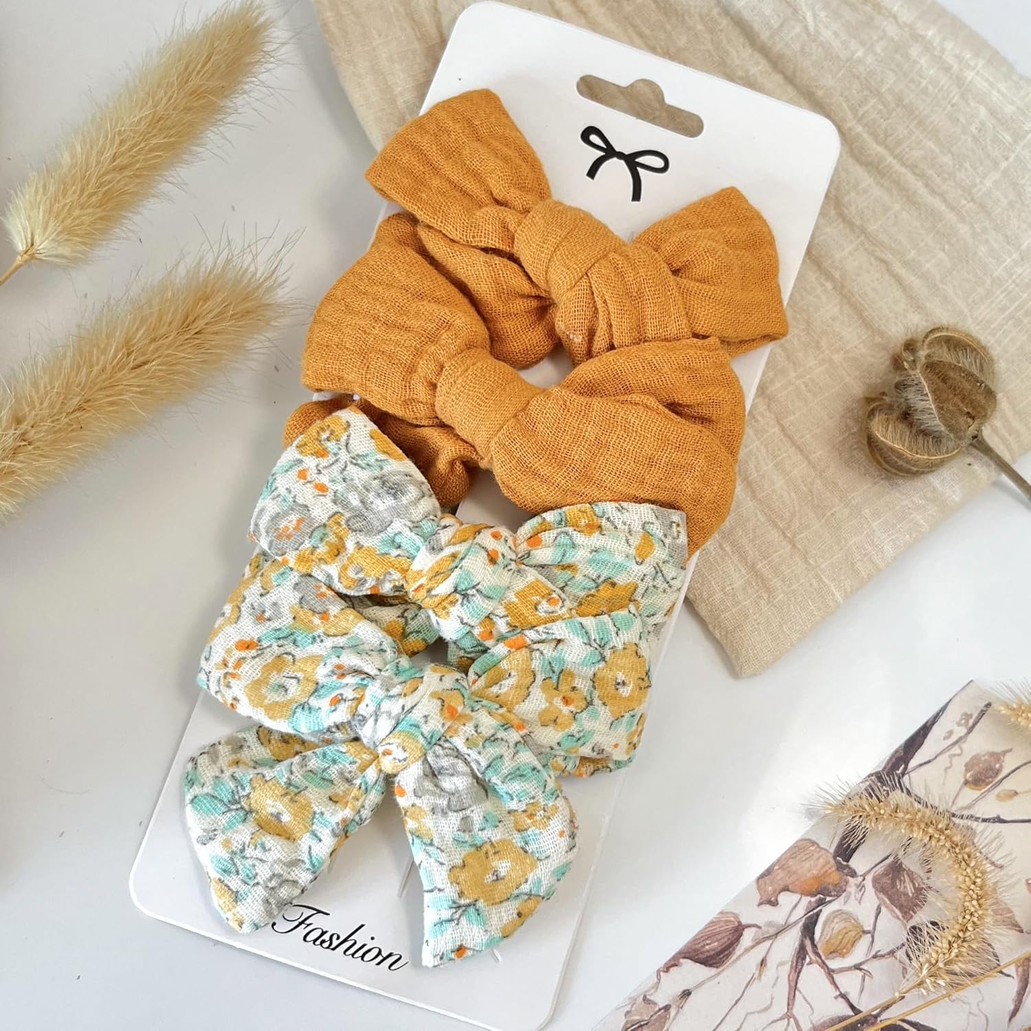 Summer 4pcs Hair Clips for Girls, 3 Inch Muslin Gauze Baby Clip Bows Fully Lined Baby Barrettes, Soft Cotton Floral Girls Hair Clips Toddler Hair Accessories for Infant in Pairs (Yellow)