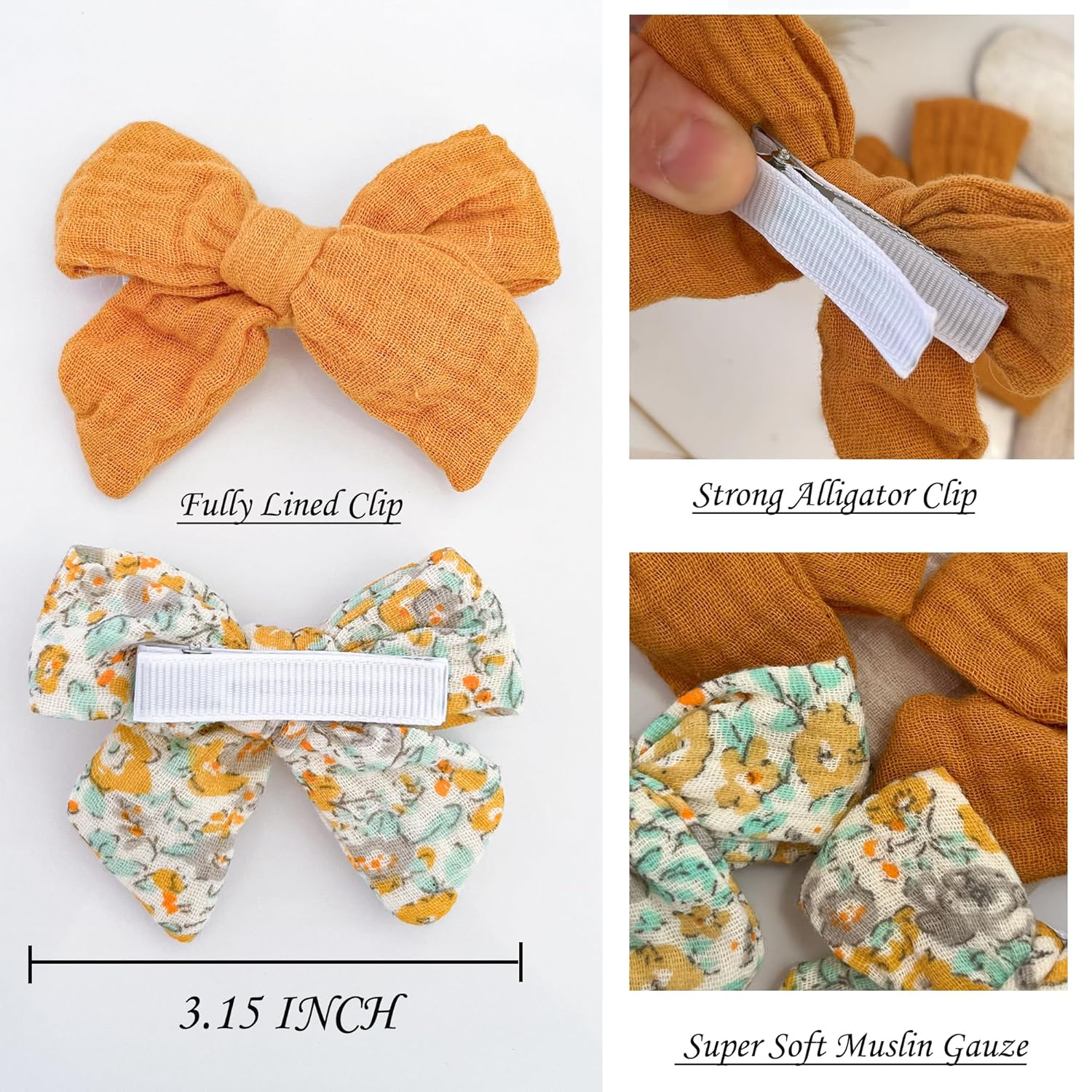 【Soft Material】Our girls hair bows are safe and comfortable for your girls. They are handmade with vintage high-quality Muslin Gauze fabric,very soft and durable,perfect for baby! The fully lined alligator clip have a strong grip clip base, won’t damage your little girl’s hair and won’t slip off.