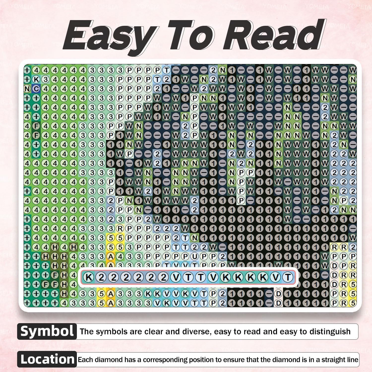 EASY TO READ: Diamond art numbers and symbols on the HD canvas are clear and easy to read. The drills adhered to the canvas without difficulty, and the diamonds stays on very good, wouldn’t fall off.