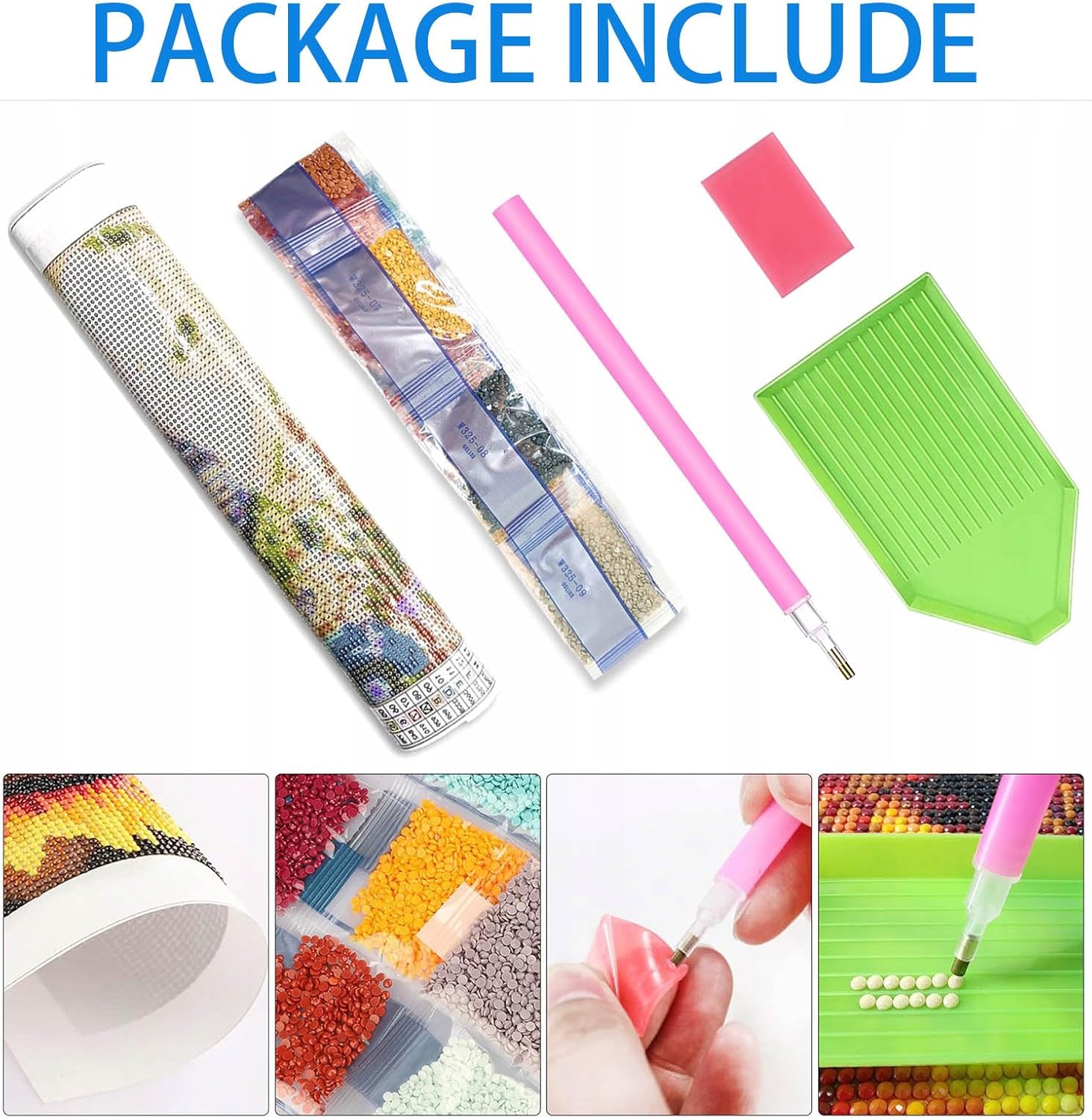 WHAT YOU WILL GET: 1*high definition painting canvas,1*point diamond pen,1*cube diamond tray,1*red glue clay,enough colorful round diamonds.We provide an extra 30% beads to ensure that the diamond painting can be completed smoothly.