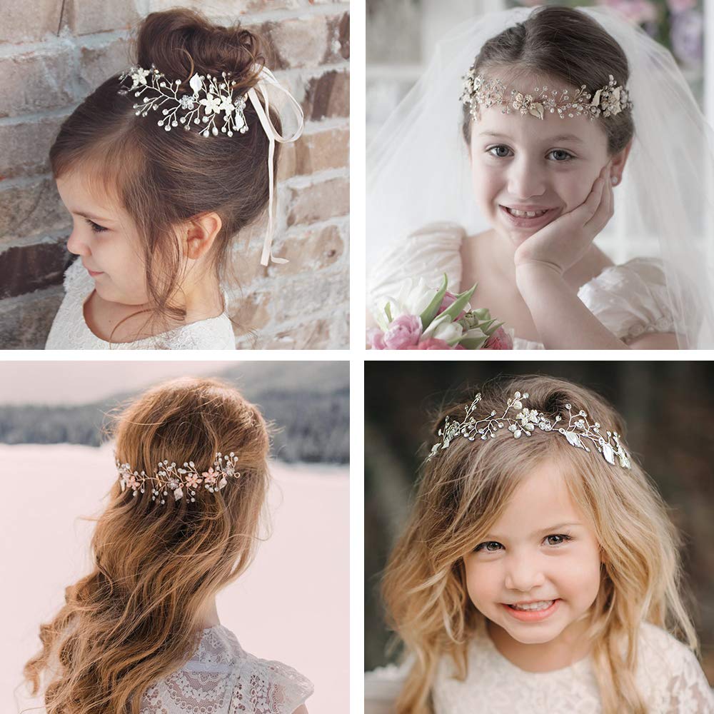 SWEETV Flower Girl Headpiece Silver Princess Wedding Headband -Baby Girls Flower Pearl Hair Accessories for Birthday Party, Photography
