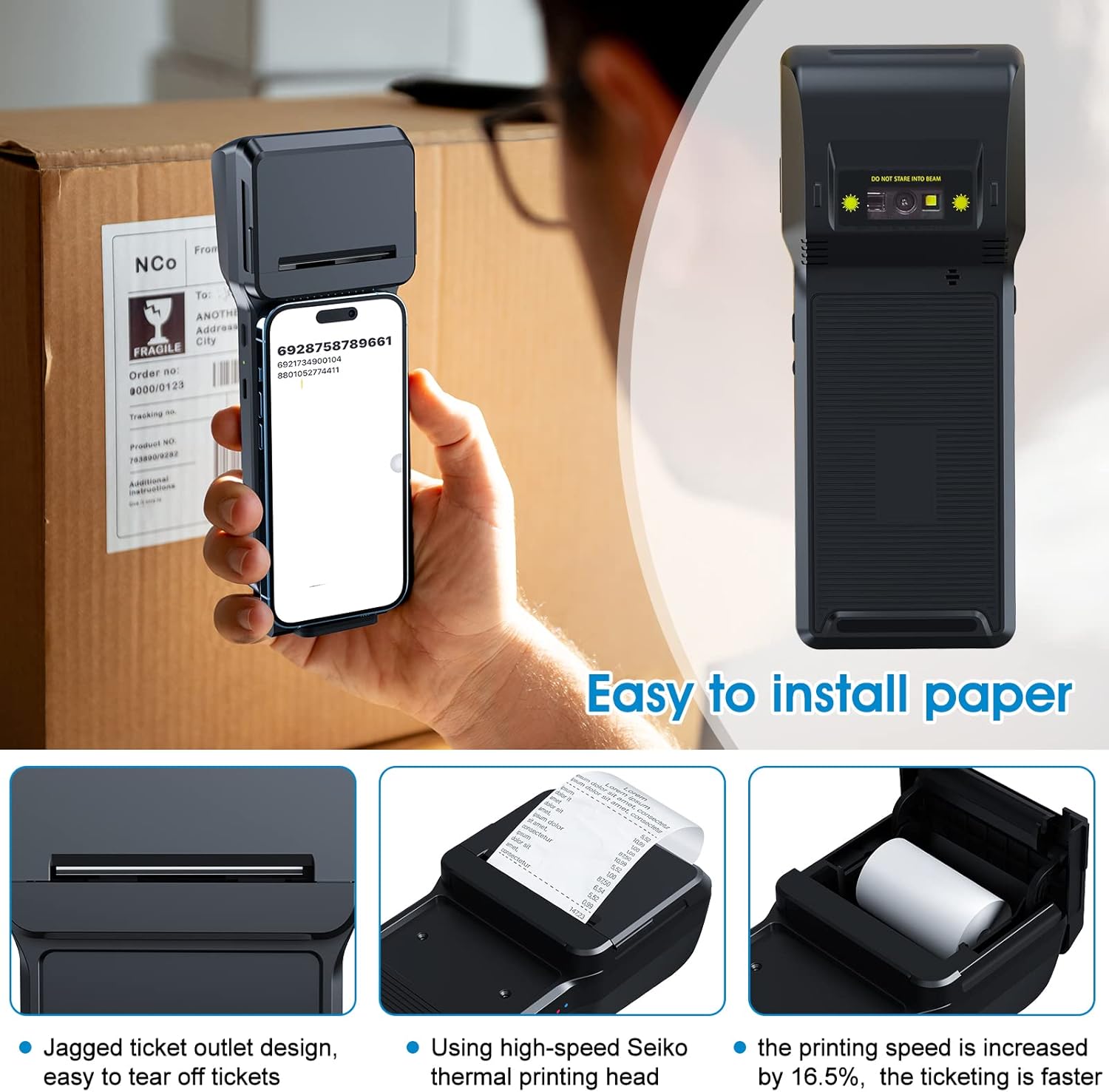 2.Can be used as Affordable POS PDA Receipt Printer use ,The camera mainly decodes 1D 2D codes.It is a combination of Bluetooth thermal printer and mobile phone, so that you can save your money and space, Widely used in food trucks, cafes, drink & food, pizza, bakery, restaurant, grocery store, fashion & boutique, convenience store, jewelry, carwash.