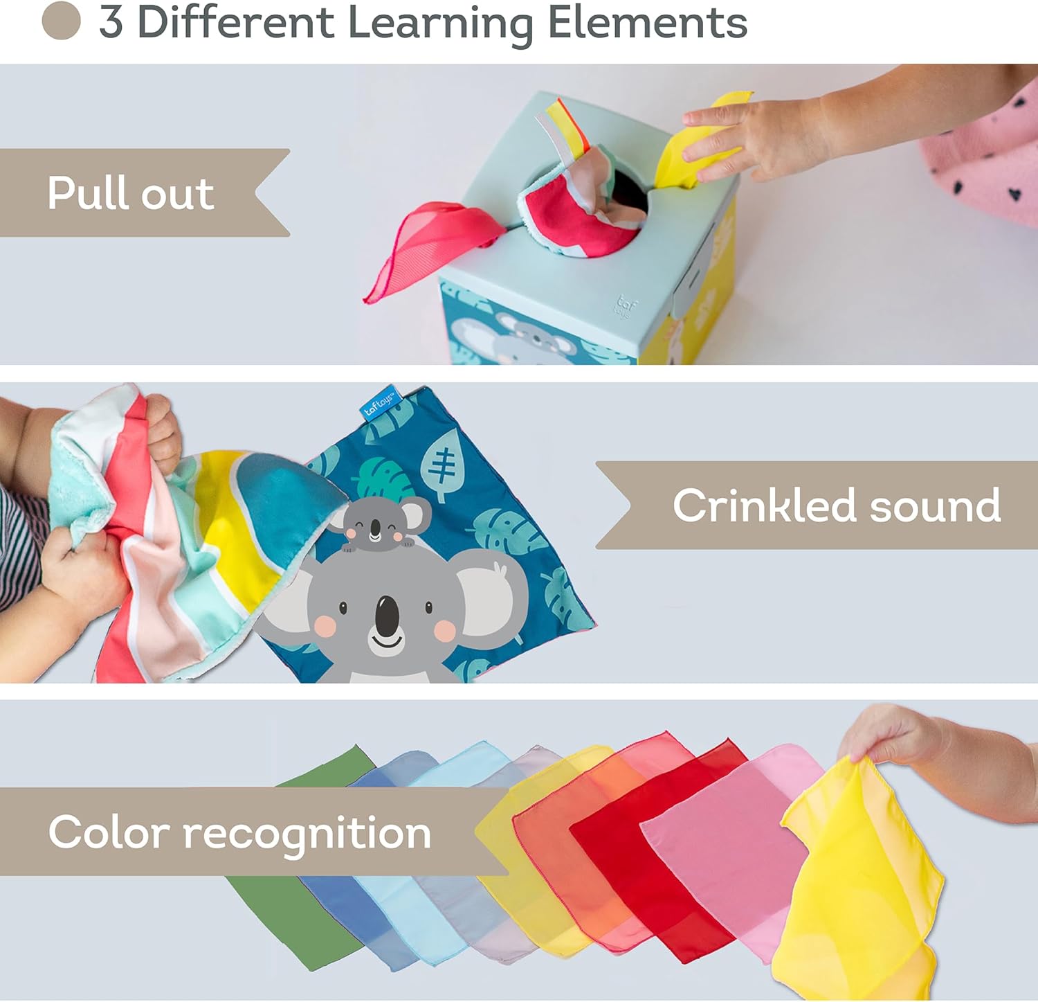 Taf Toys Sensory Crinkle Tissue Box for Toddlers. STEM Montessori Toy with Colorful Soft Scarves and Crinkling Blankies