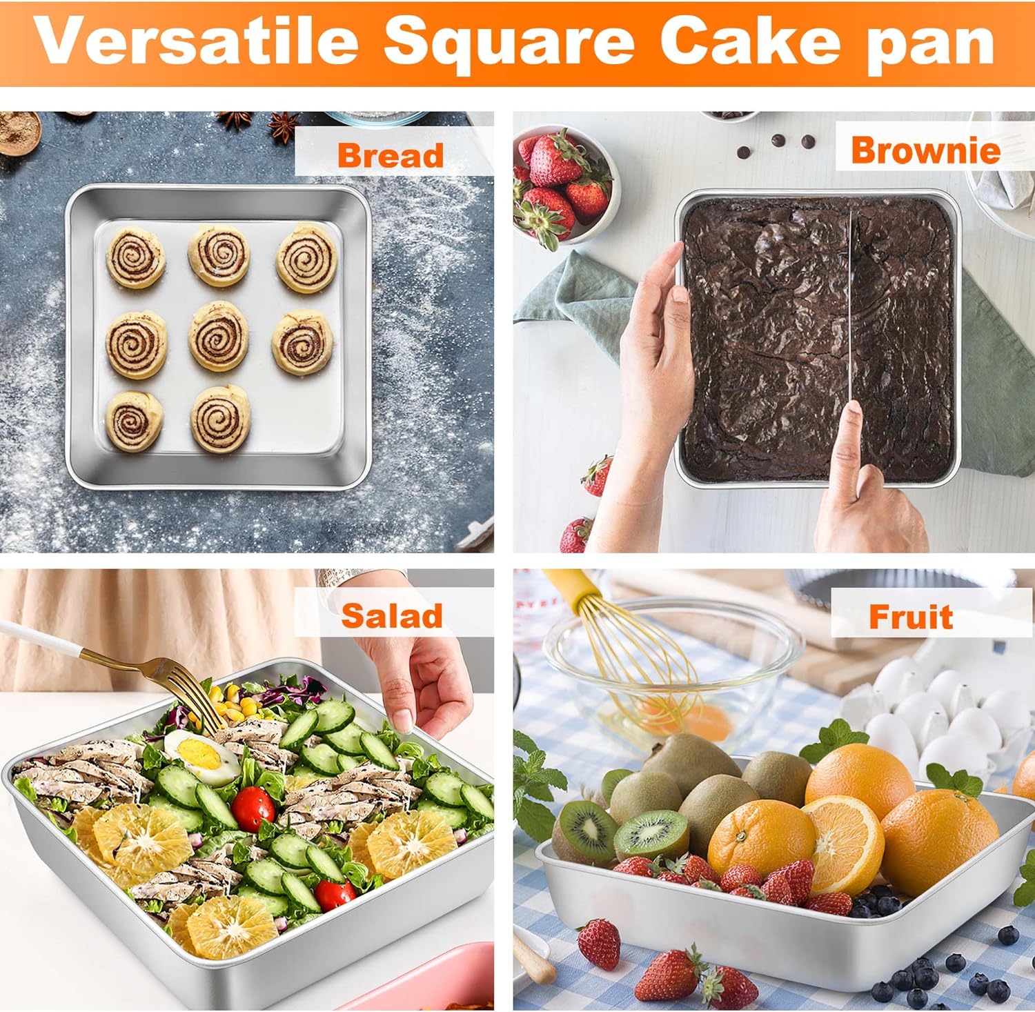 Multi-Use: 9.3’’ x 9.3’’ x 2’’ square cake pan is perfectly fitting in most regular oven, Ideal for making square cakes, Baking brownie, Storing leftovers, Even efficient as a serving pan for fruits & snacks, Freezer safe to store food in the fridge