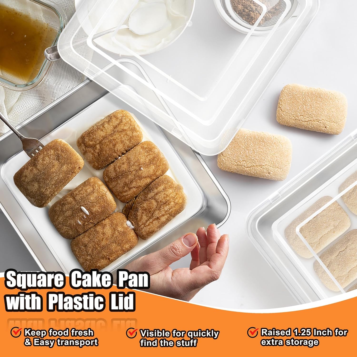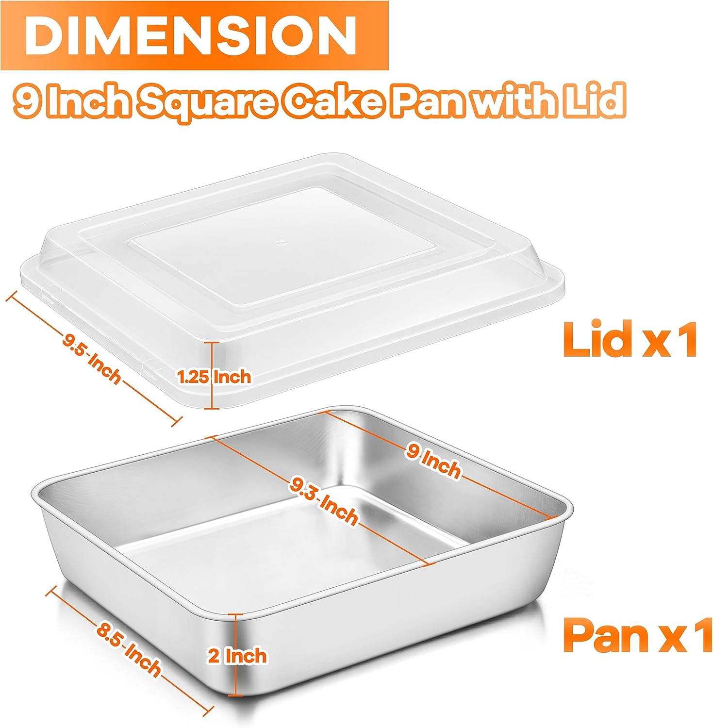 Visible Plastic Lid: The square baking pan with lid covers tightly to avoid spilling the stuff, The lid with 1.25 inch height for extra space to avoid crushing the top decoration of the cake, Prevents from getting dust, Avoid tainting the flavor and keeping food fresh in fridge and also convenient to carry out, Clear and visible lid help quickly and clearly find the food