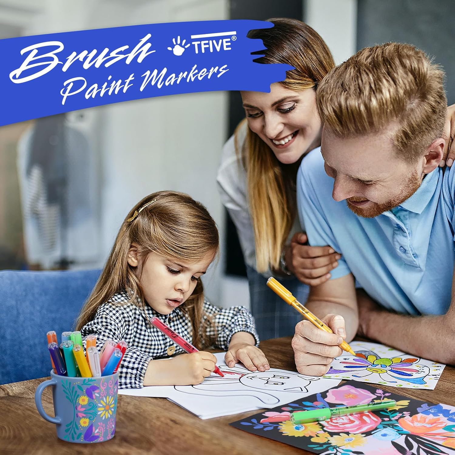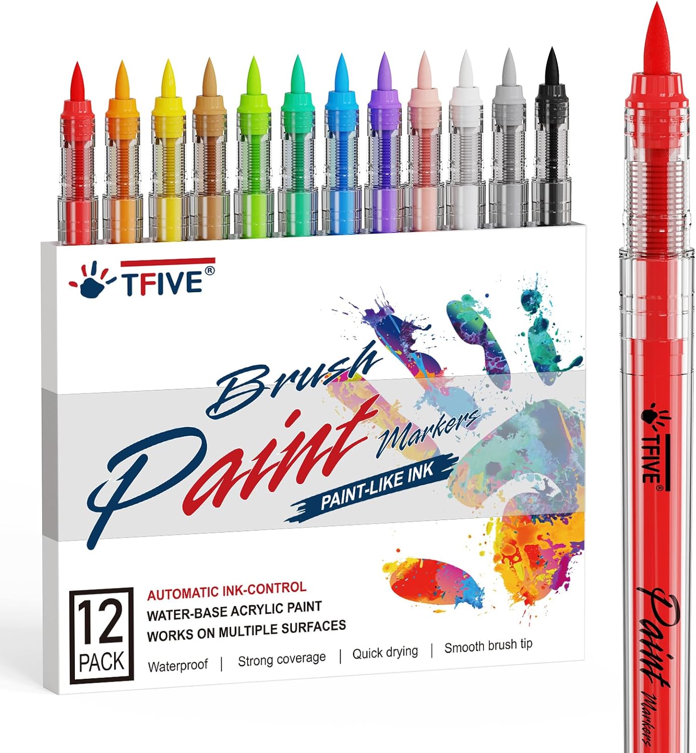TFIVE Paint Marker Paint Pens, Acrylic Permanent Water-Based Brush Tip Marker, Quick Dry Waterproof Paint Marker Pens for Art, Drawing, Rock, Ceramic, Glass, Wood, Plastic, Metal, Canvas DIY Crafts