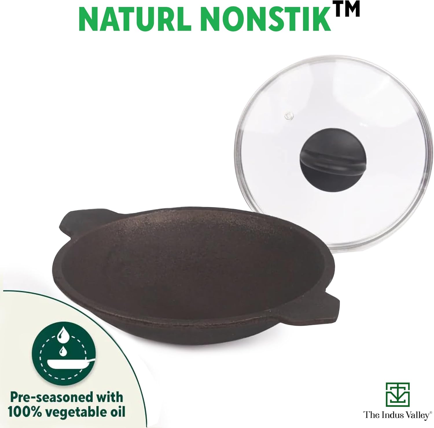 The Indus Valley Pre-Seasoned Cast Iron Appam Pan With Glass Lid | 25.4 Cm/10 Inch, 1.5Kg | Gas Compatible | Nonstick Appam Pan, 100% Pure & Toxin-Free, No Chemical Coating, Black