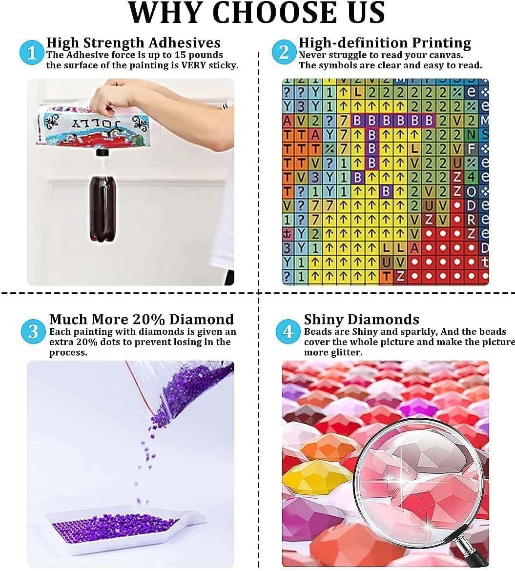 💎【High-quality canvas】Our diamond painting kits use high-quality canvas, the canvas is clear, waterproof, without creases, the letter symbols are clear and easy to understand, the DMC code on the diamond art painting corresponds to the color of the drill bit, and the canvas uses environmentally friendly water-based glue, which is strong. Make sure that the drill bit will not fall off.
