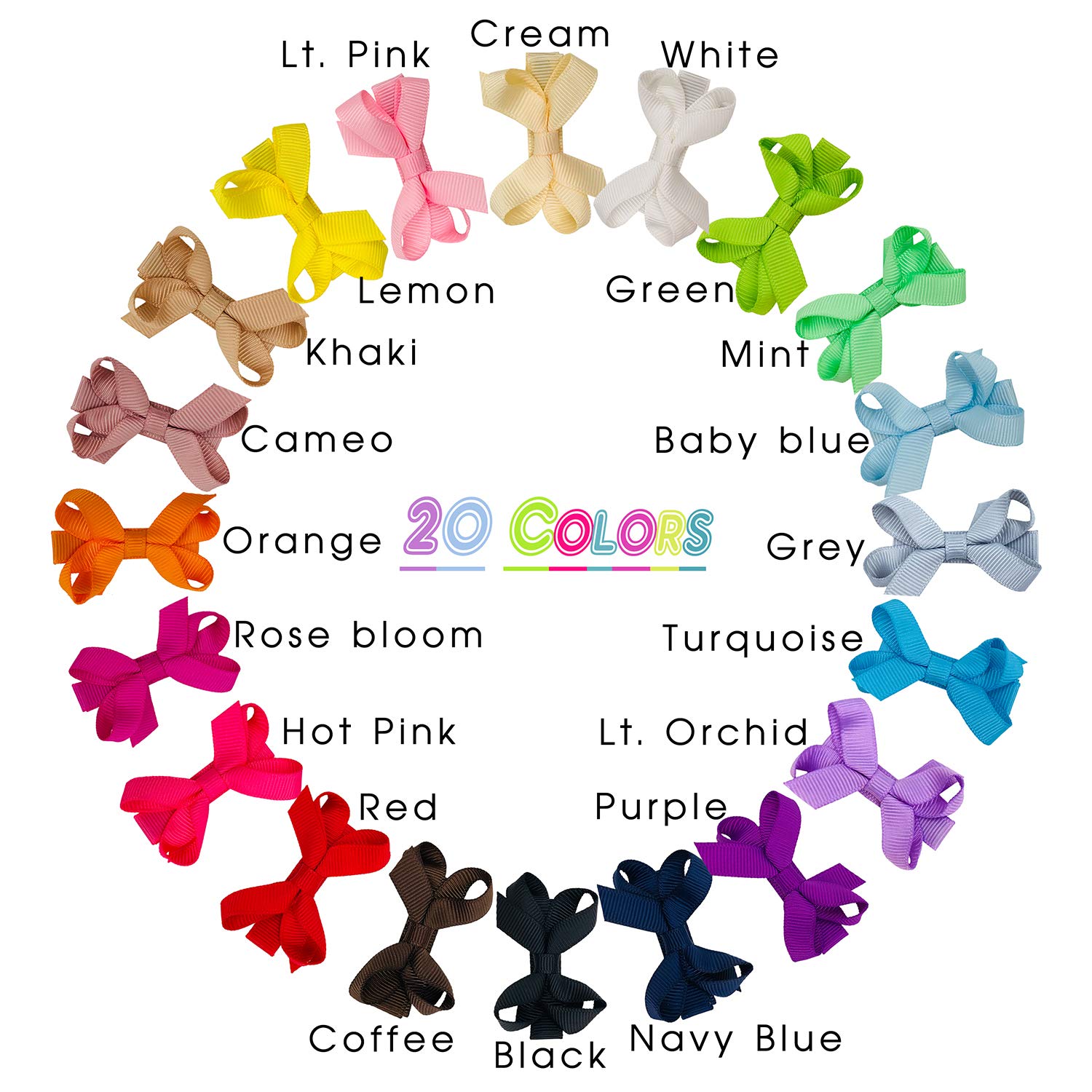 Set of 20pcs;Bow size:2″;Made from grosgrain ribbon;Atttached to fully lined clips.