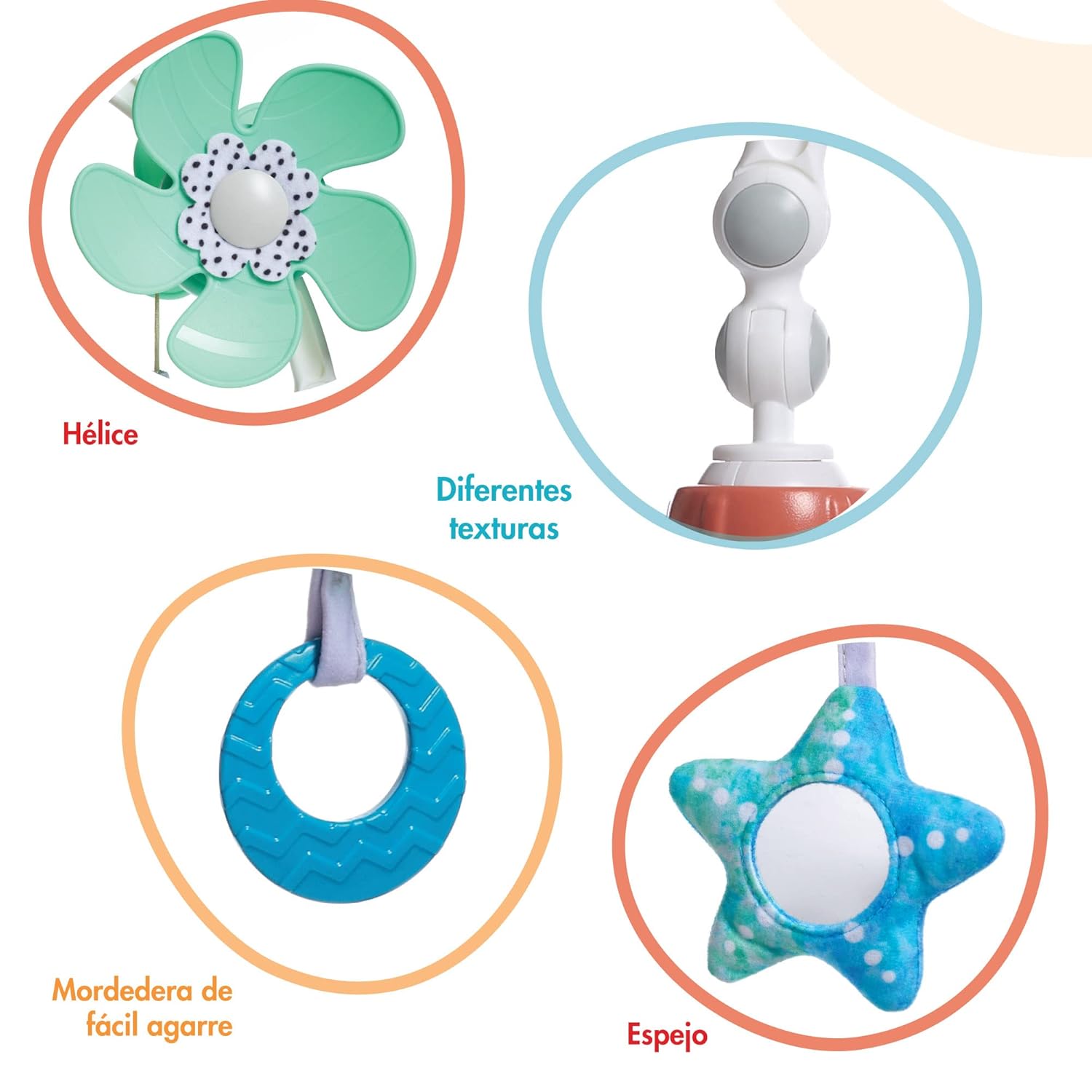 Baby-activated propeller spins when baby pulls the handle, supporting cognitive development.