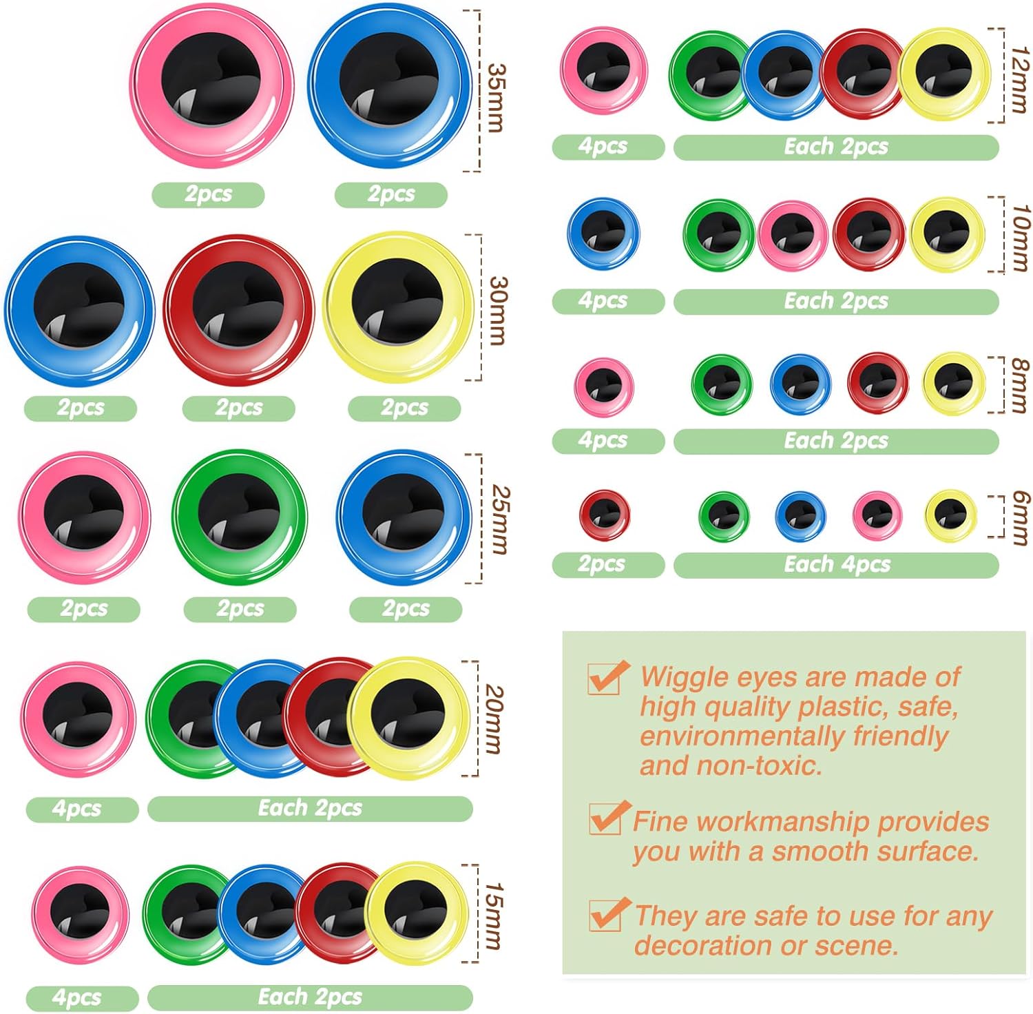 Variety Choices: 100pcs googly eyes, 6mm,8mm,10mm,12mm,15mm,20mm,25mm,30mm,35mm, eyes of different sizes and colors can meet your different needs