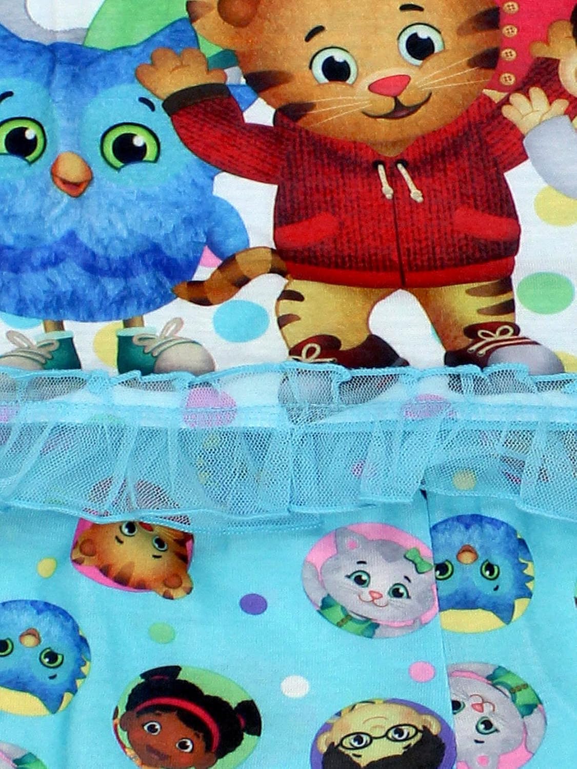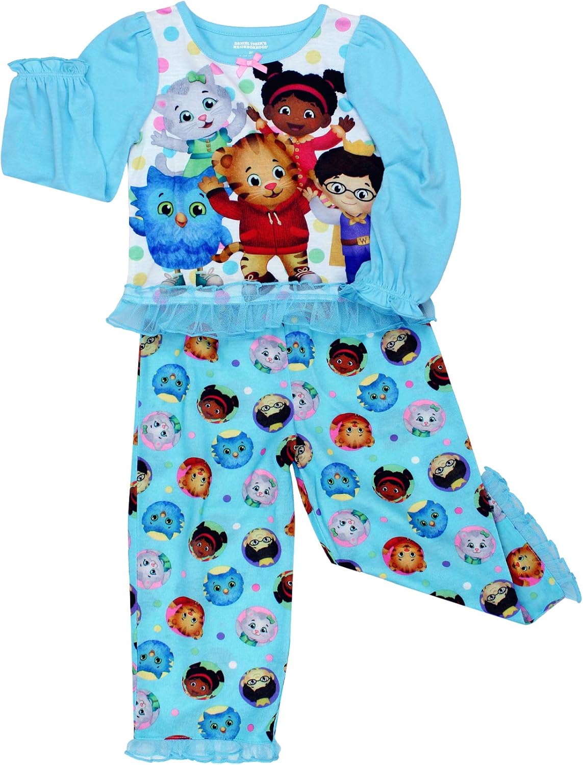 Sing and dance around Daniel Tiger’s neighborhood in this adorable Yankee Toy Box exclusive toddler girl’s Daniel Tiger pajama set! This two-piece set features your favorite Daniel Tiger’s Neighborhood characters: Daniel Tiger, O the Owl, Katerina Kittycat, Miss Elaina, and Prince Wednesday. This cute pj set contains long sleeves with elastic cuffs and ruffles, a bow detail, a ruffle tulle hem the shirt and cuffs of the pants for added style, an elastic waistband, and sublimated graphics. This pajama set is perfect for any fan of Daniel Tiger’s Neighborhood! Available in toddler girl’s sizes 2T, 3T, 4T, and 5T.