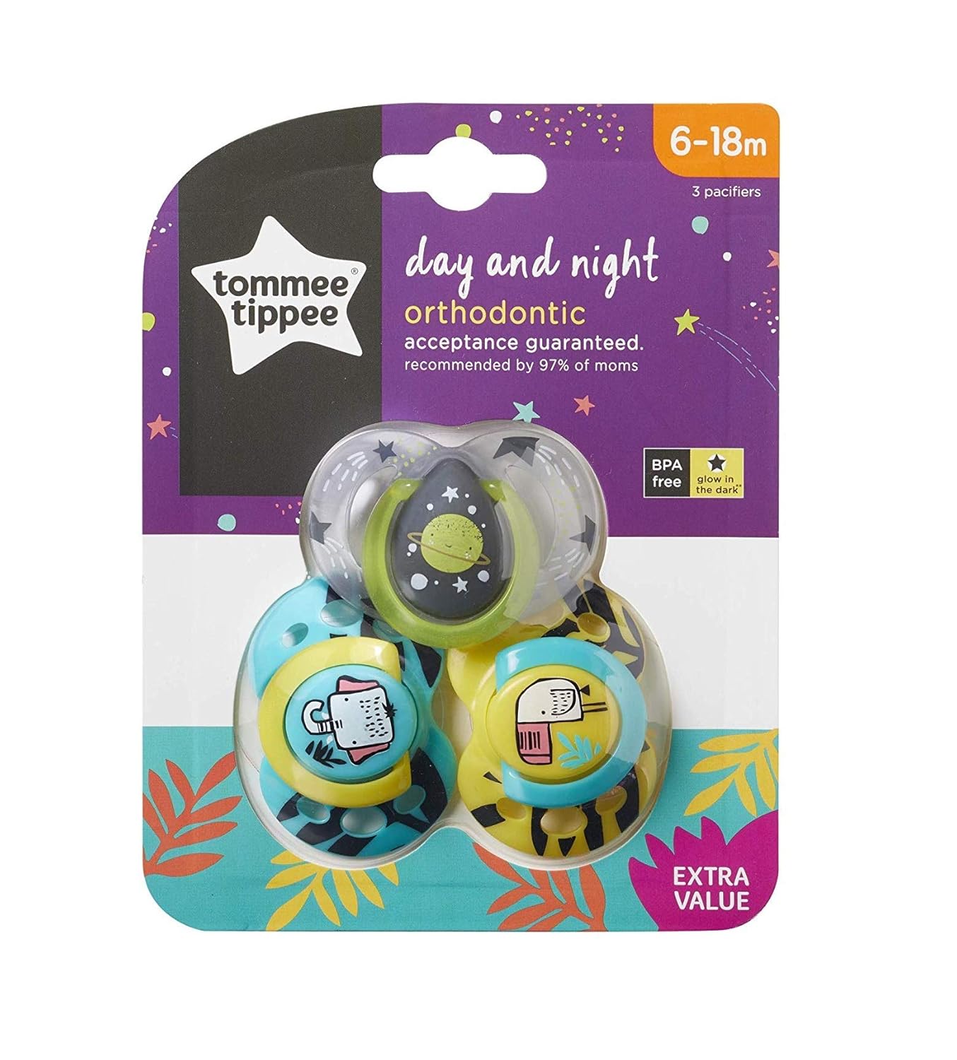 Tommee Tippee Day and Night Pacifiers, Symmetrical Design, BPA-Free Silicone Binkies, 18-36m, 3-Count, Colors and Designs May Vary