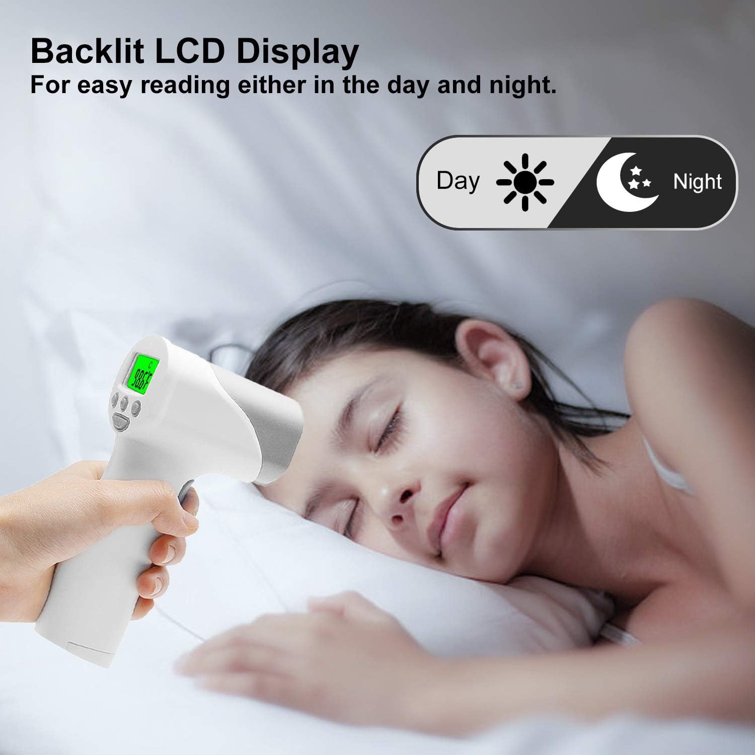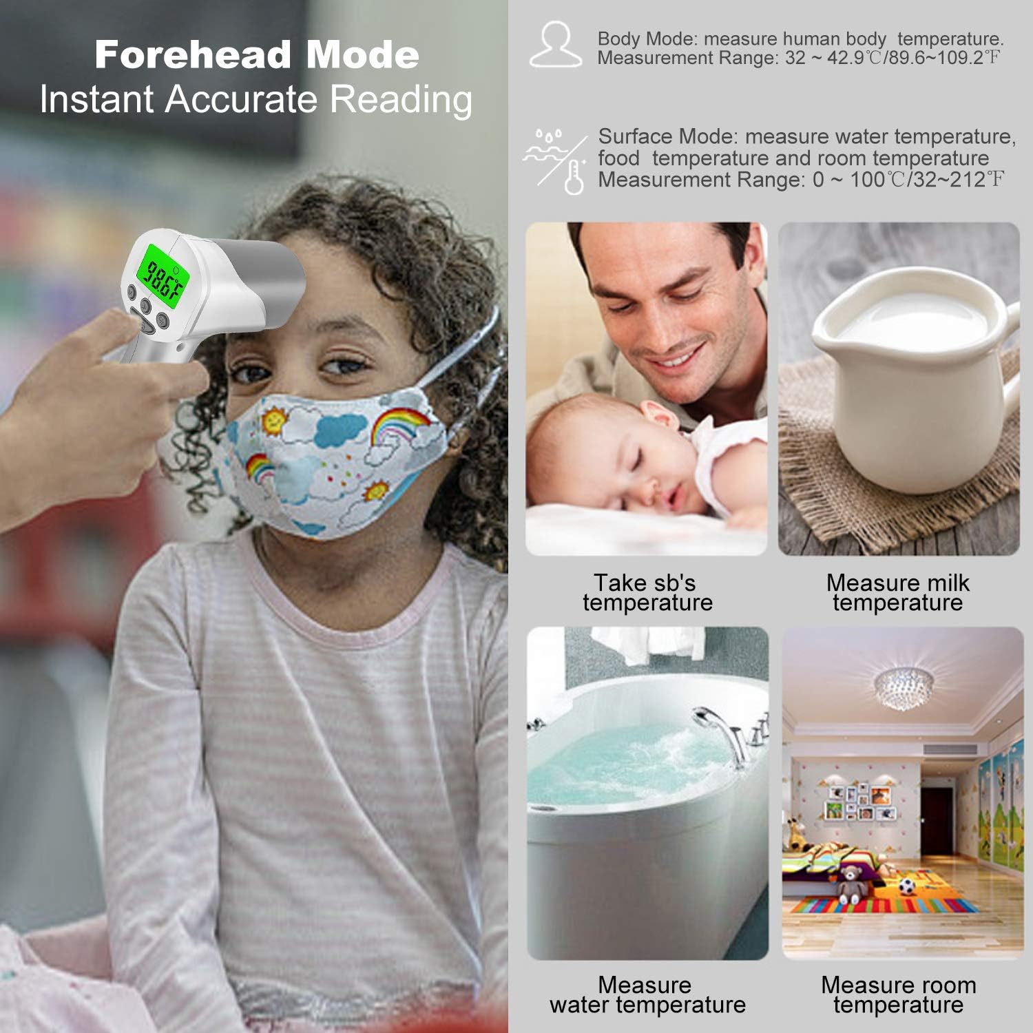 【Multiple measurement modes】:With large backlit LCD screen , you can get the measurements clearly in the dark without disturbing your baby’s sleep. And the touchless forehead thermometer is designed for all ages, adults, baby kids and elders.