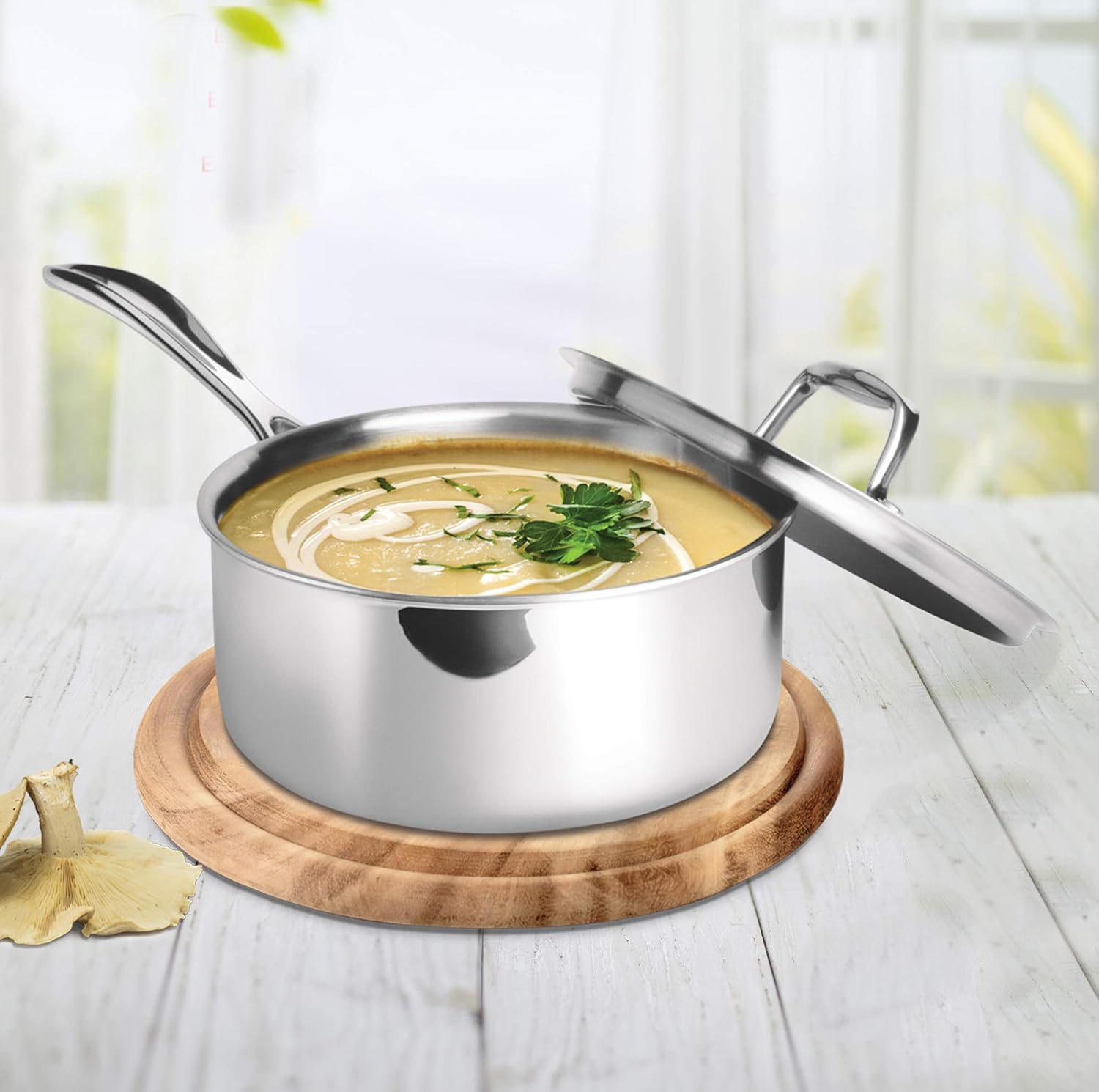 With Tri-Ply Stainless steel cookware, get both beauty and performance while tackling your culinary needs. Cook-up a storm with this technology that faciliates even distribution of heat. Handling and maintenance comes easy with this stain and stick resistant range. The air fin handle of the Sauce pan makes lifting, pouring and cooking convenient. You can use it to boil, heat and reheat a variety of food. Using the lid helps retain the heat in the pan and thus accelerate the process of cooking evenly. Cook faster, healthier and happier in this beautiful piece of art. The cookware range wins on aesthetics and thus can be taken directly to the dinner table from the hob. Compatible with all heating sources like induction, gas, hot plate, it is easy to clean. Ideal to prepare tea, coffee and other hot beverages along with boiling pasta, steaming vegetables, making sauces, or cooking grains in it.