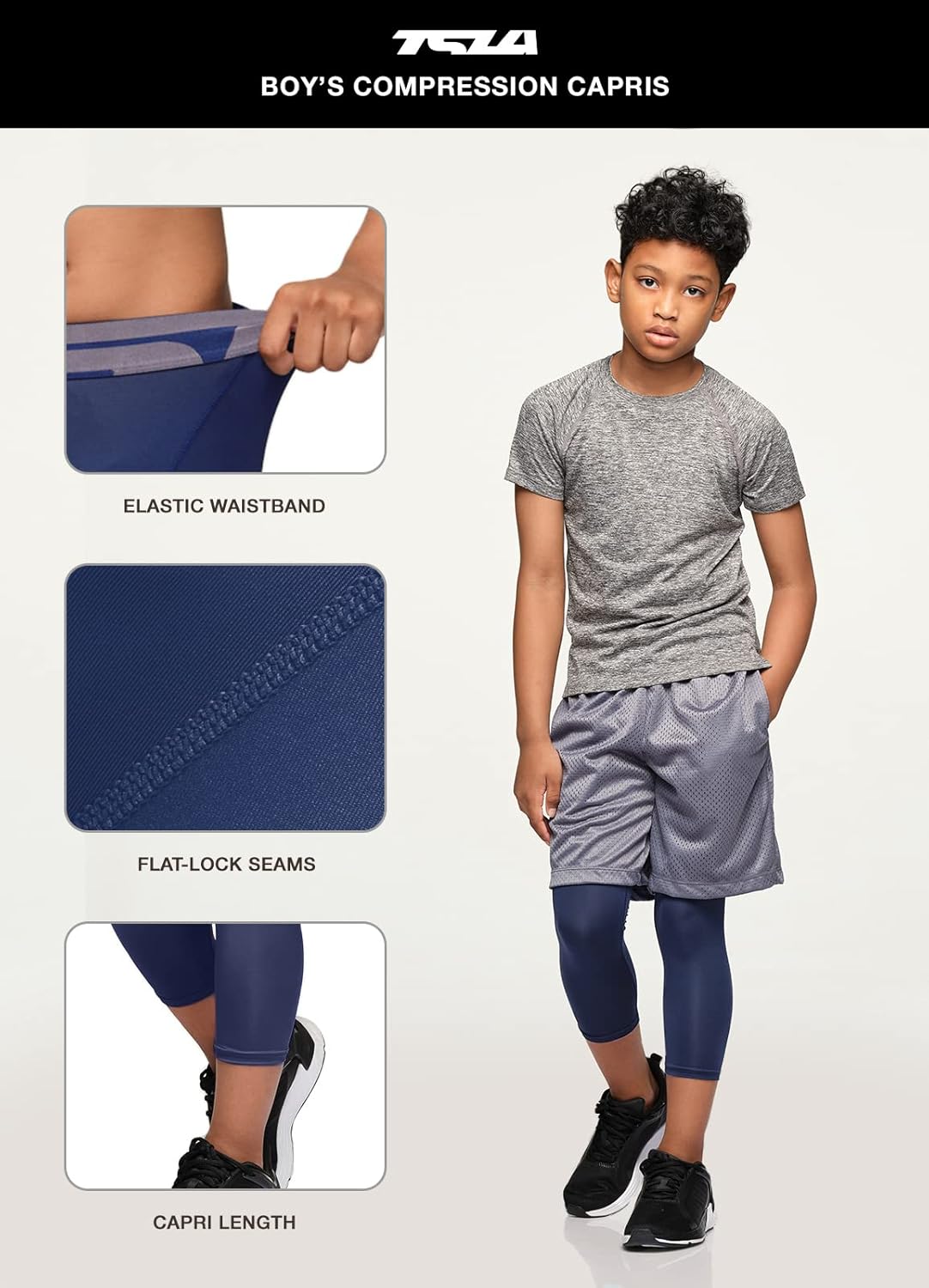 TSLA 1 or 2 Pack Boys Youth UPF 50+ Compression Pants Baselayer, Cool Dry Running Tights, 4-Way Stretch Workout Leggings