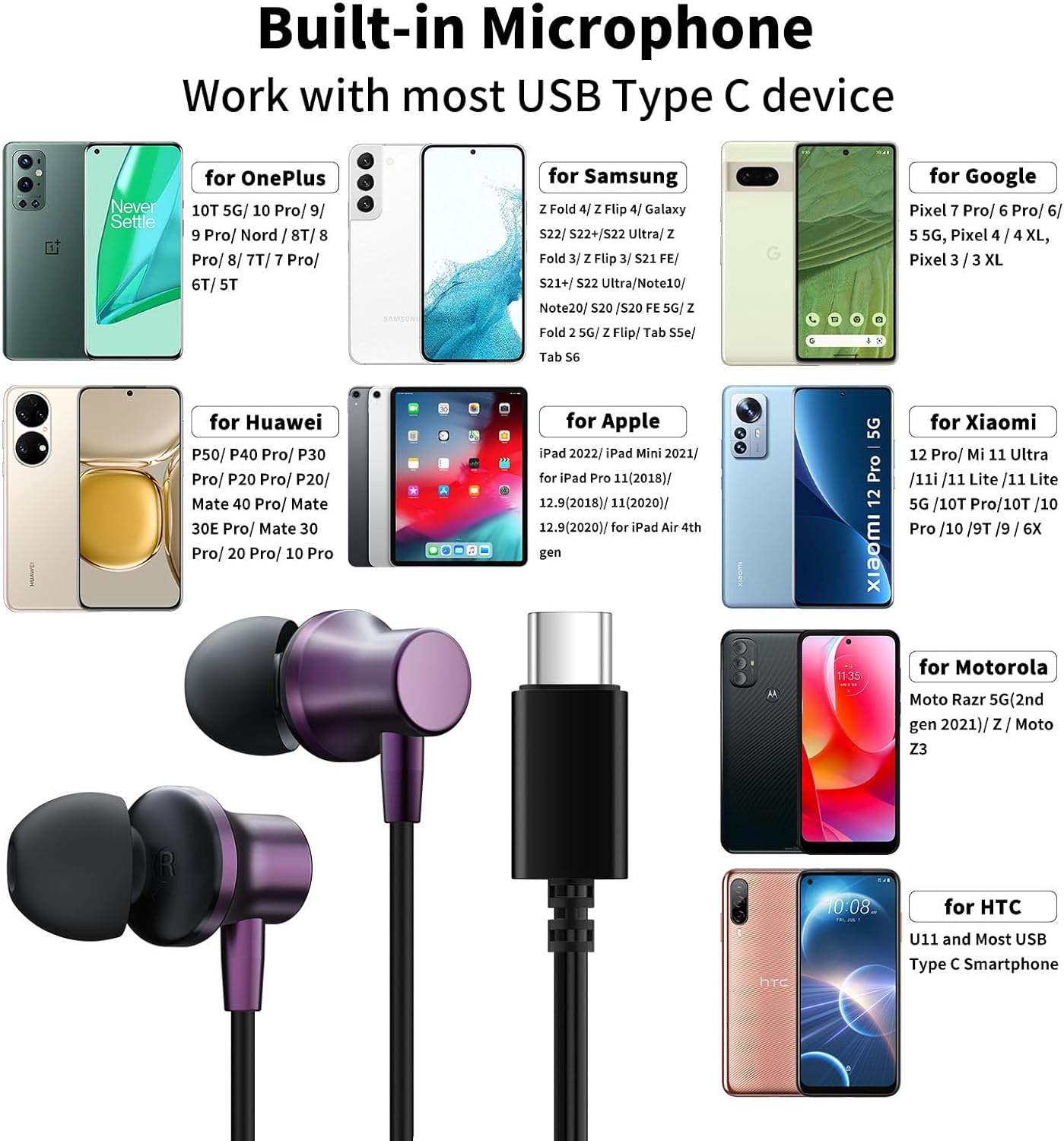 🎵 USB C Wired Headphones for iPhone 15/15 Plus/15 Pro/15 Pro Max, for Samsung S24/S24+/S24 Ultra, Galaxy S23/S23+/S23 Ultra, Galaxy Z Flip/Fold 5/4/3/2, A55/A53/A54/A33/A34/A35, Galaxy S22 Ultra/S21 FE/S21/S21+/S21 Ultra/S20 FE/S20 Ultra/S20+/S20, Galaxy Tab S8/S8+/S8 Ultra/S7, Note 20/20+/20 Ultra/10/10+, for OnePlus 12R/12/11/10T/10 Pro/ 9/Nord/8T/8/7T /7/6T, for Google Pixel 8 7 Pro 6a 6 5 4 3 2 XL, for Macbook Pro/ Air, for iPad 10th Gen, for iPad Pro/Mini /iPad Air 2024 for USB-C device.