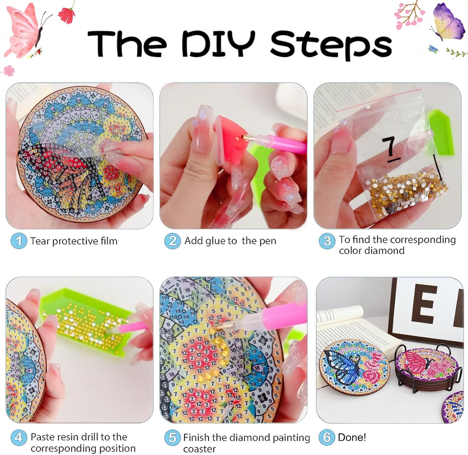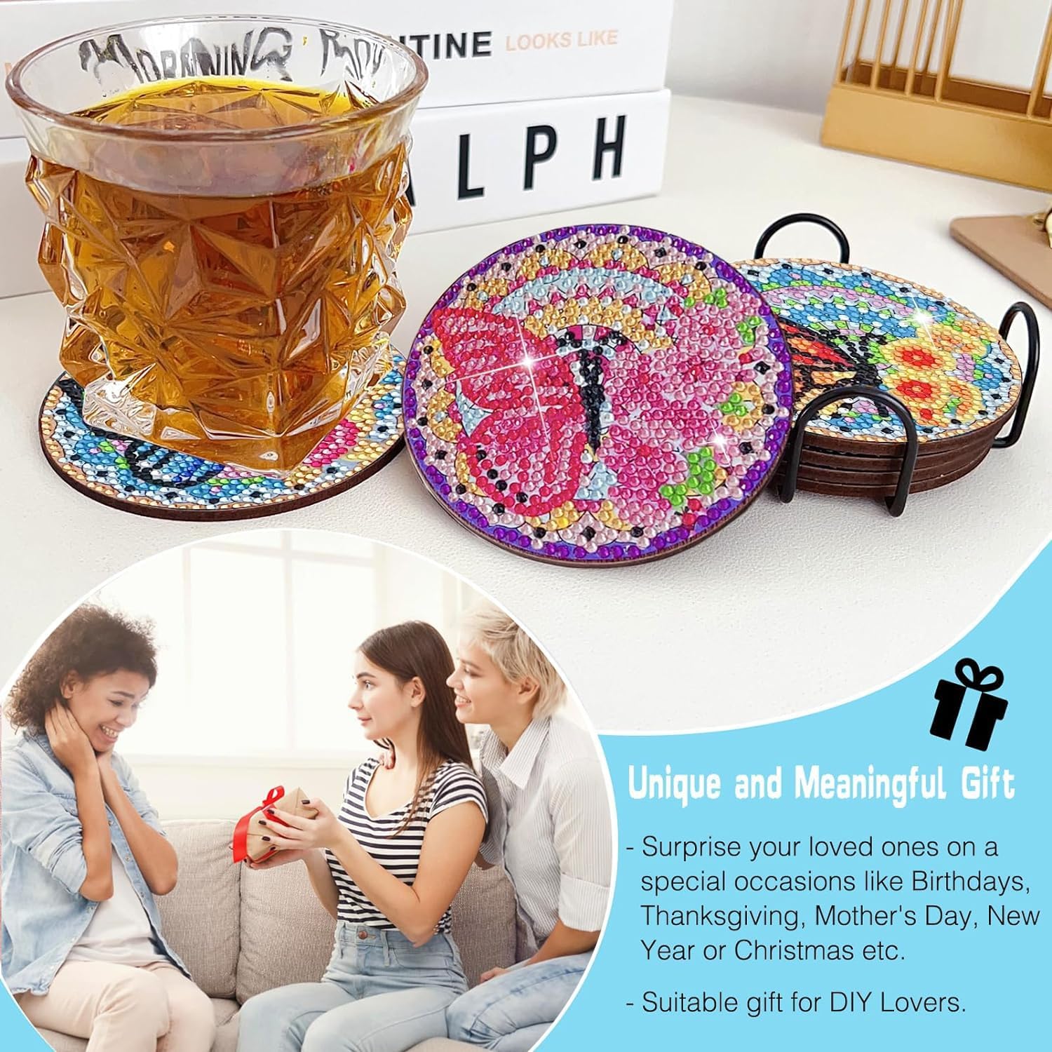 Butterfly Diamond Painting Art Coasters with Holder Package Included: -Diamond Painting Coaster x 6 -Coaster Holder x 1 -Various Colorful Diamond x 17 -Clay Glue x 1 -Diamond Pen x 1 -Diamond Tray x 1 -Customized Box x 1 Unique and meaningful gift in Christmas, Farewell, Birthday, Thanksgiving, Housewarming, New Year, Wedding And Engagement, Mothers Day, Easter, Thank You And Appreciation, Back To School, Womens Day, Valentines Day etc special holiday or moments.