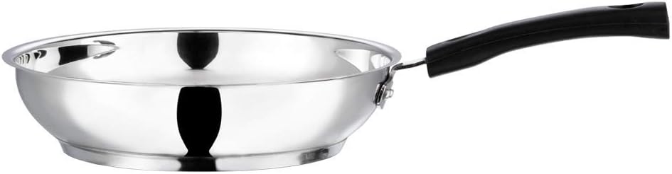 “This Vinod stainless steel frypan is the way to healthy frying and more. The robustly designed base facilitates even heat distribution so your food cooks throughly without burning. Constructed with AISI 304 food grade hygienic stainless steel, the SAS bottom includes an encapulated layer of aluminium ensuring an even distribution of heat. The base layer is made from AISI 430 grade magnetic stainless steel that makes the pan both gas and induction friendly. The handle is heat resistant and offer an ergonomic grip. The hole offers convenient hanging – storage option. This is is an extremely versatile pan, giving you the flexibility to sauté or stir-fry. The Frypan is suitable for sautéing vegetables, seafood, chicken and meat.”