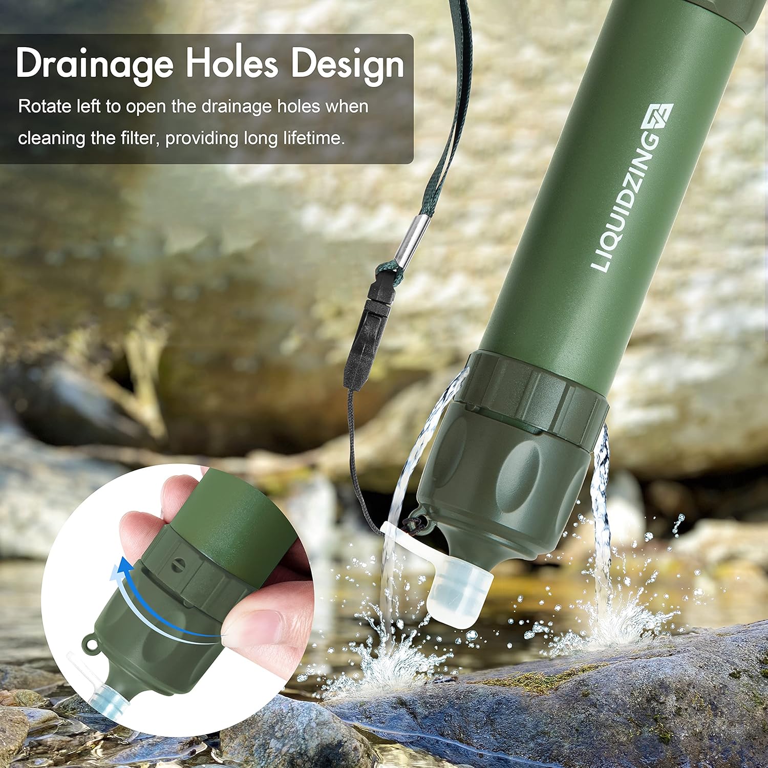 Separated Cleaning & Filtration System: Independent dirty water drainage holes on the switch design equips the personal water filter with cleaning function. The sand, impurities, sediments attached on the filer can pass out from the drainage holes, rather than from the water purification mouthpiece outlet, so the water purification mouthpiece outlet won’t turn dirty and the filter has longer lifespan, which can filter 1,000 liters/264 gallons at least.