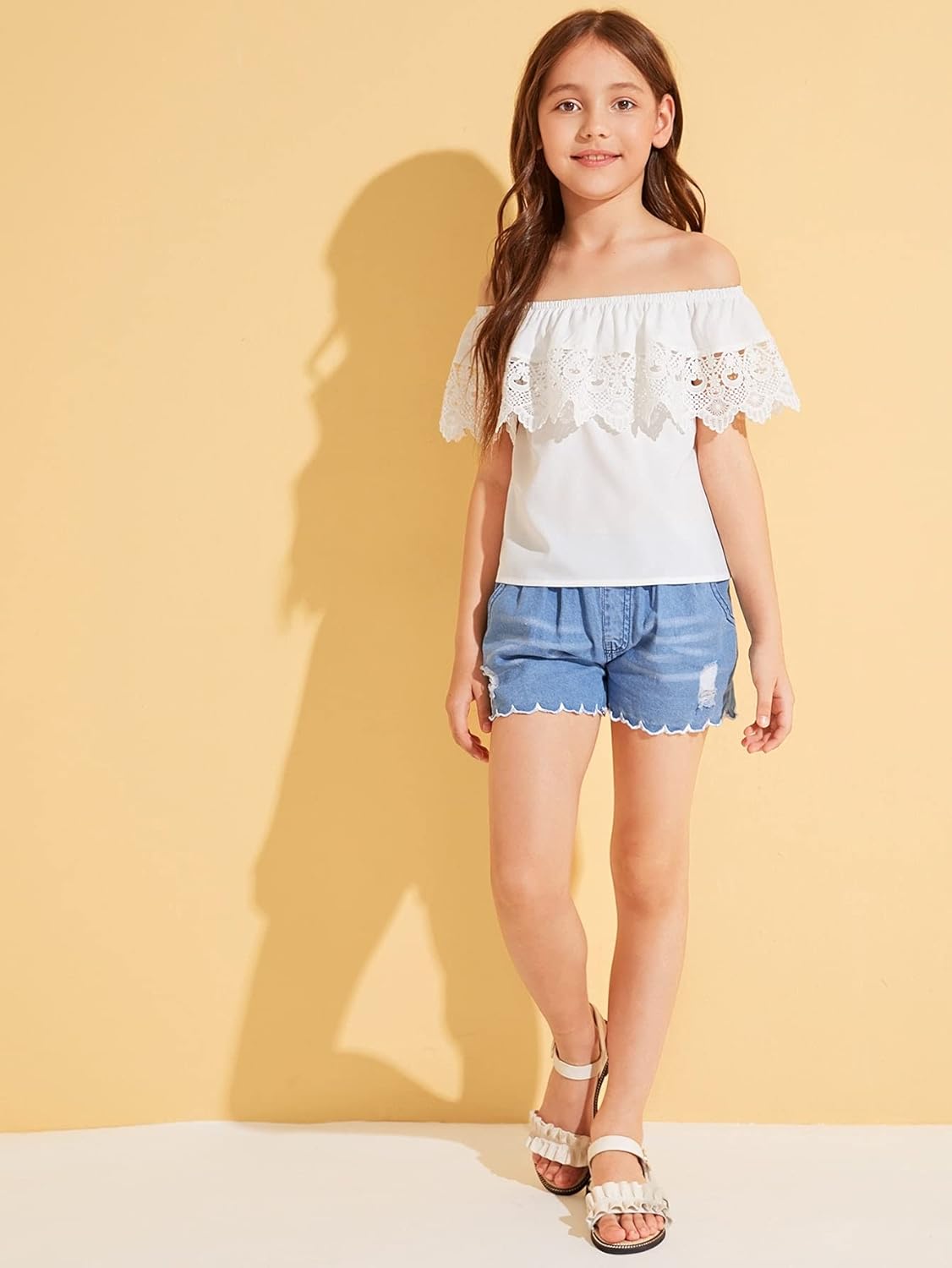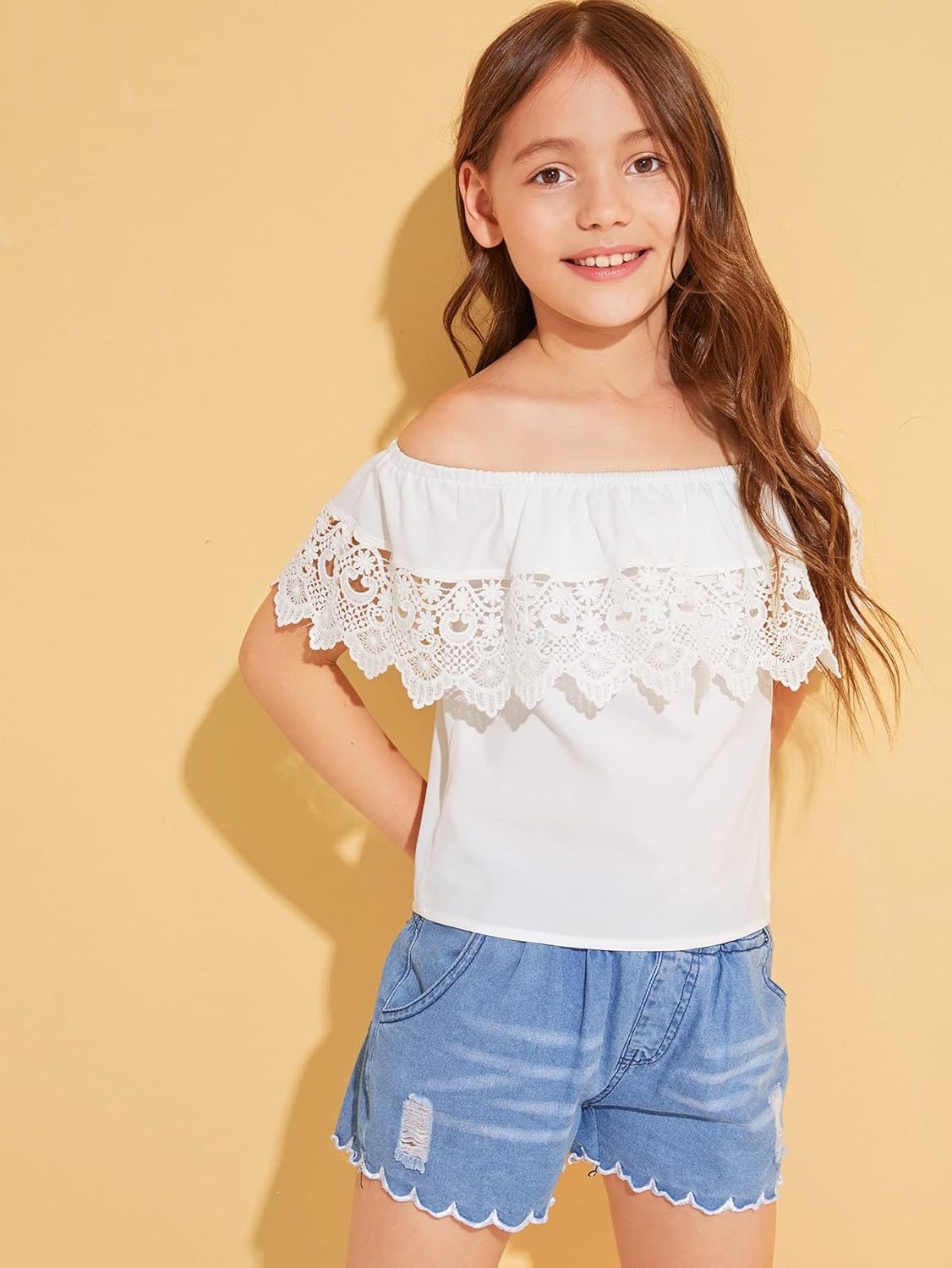 WDIRARA Girl's Off The Shoulder Ruffle Trim Lace Short Sleeve Blouse TopWDIRARA Girl's Off The Shoulder Ruffle Trim Lace Short Sleeve Blouse Top