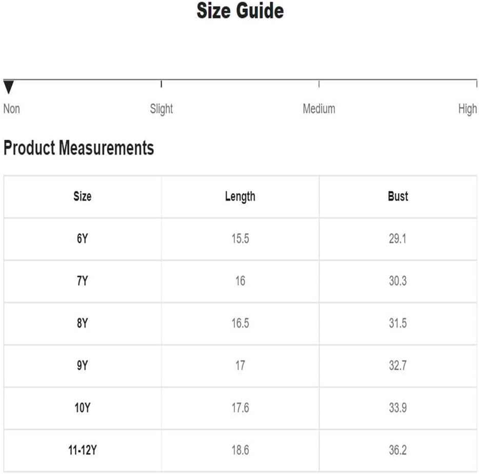 6Y: Length: 15.5″, Bust: 29.1″7Y: Length: 16″, Bust: 30.3″9Y: Length: 16.5″, Bust: 31.5″10Y: Length: 17″, Bust: 32.7″11-12Y: Length: 17.6″, Bust: 33″