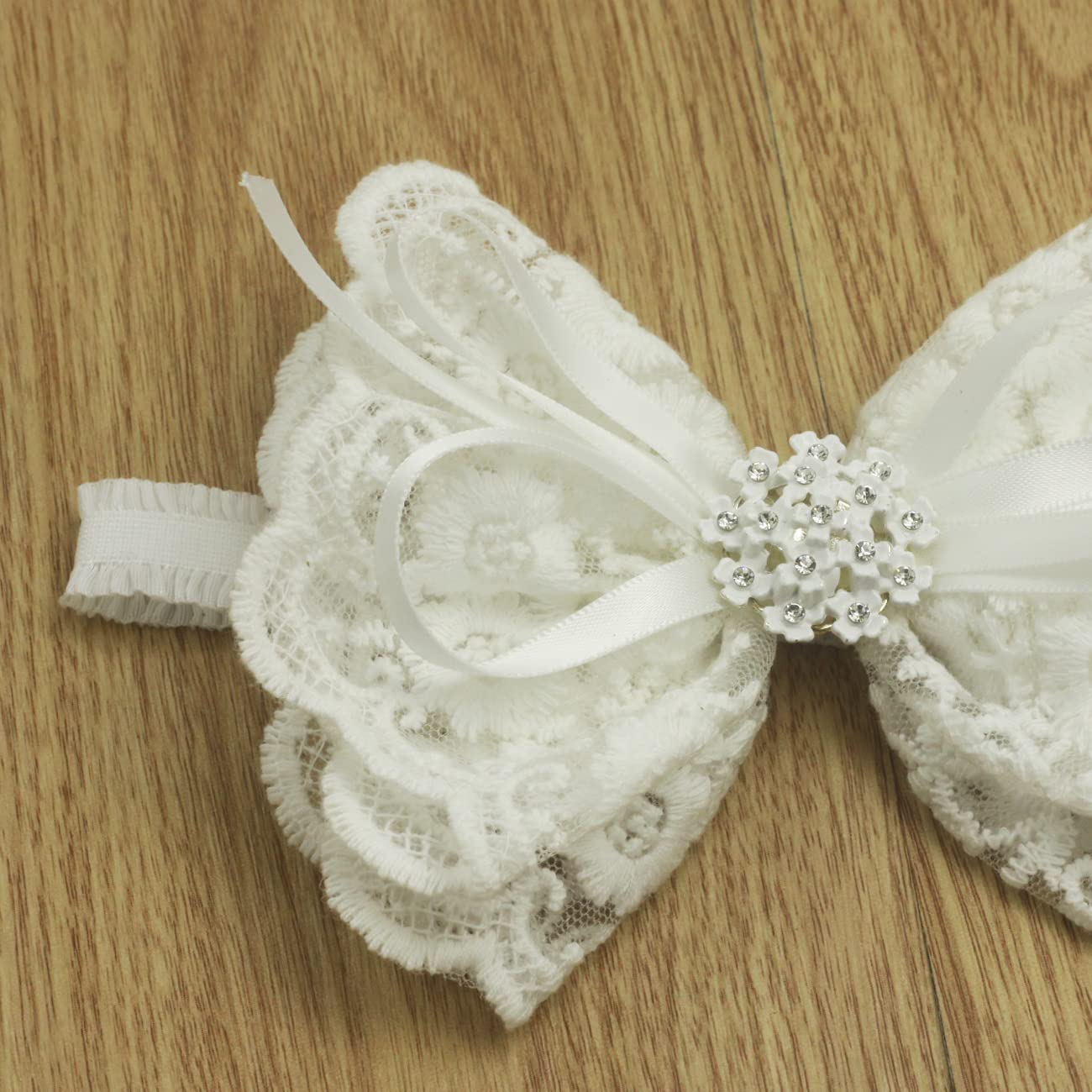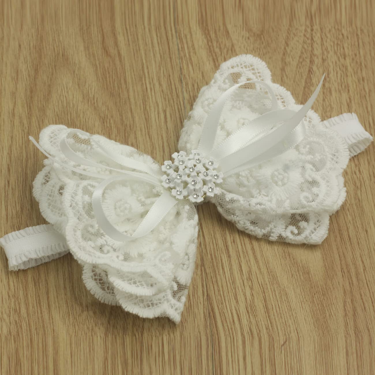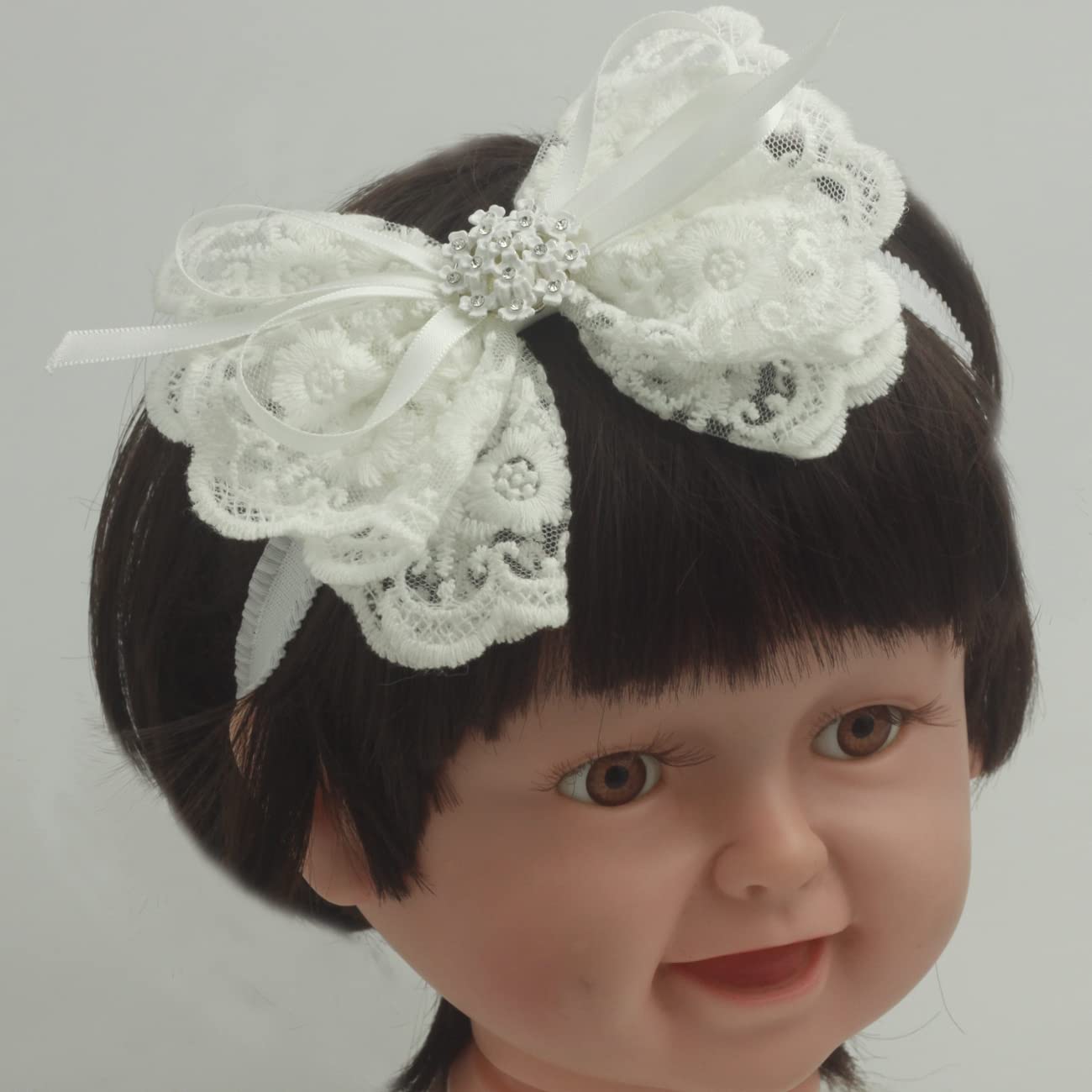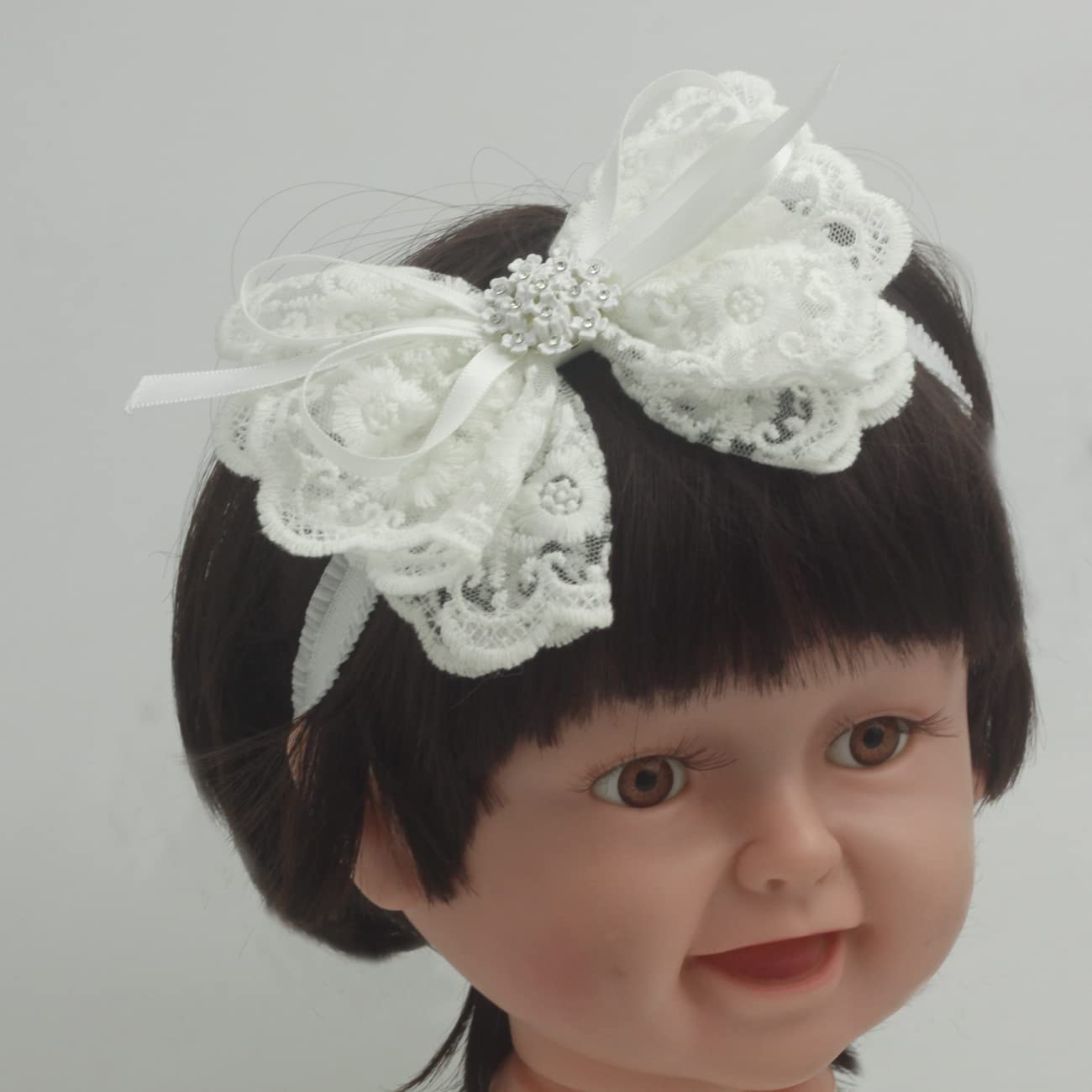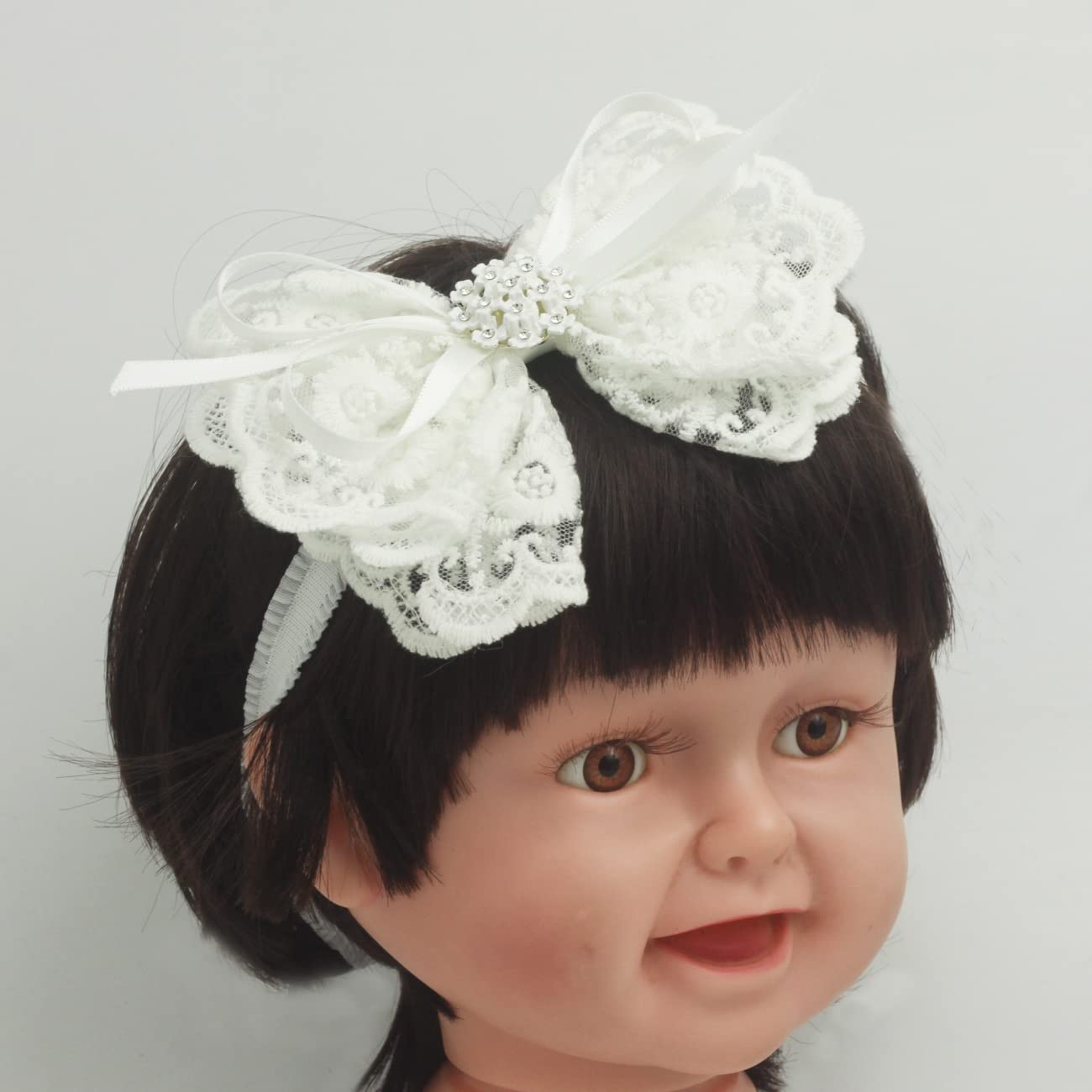White Baby Bow Headband for Baptism Christening Satin Lace Hair Band with Cross for Toddler (Embroidery Lace white bow with pearl-5, 2 years old-Teen)