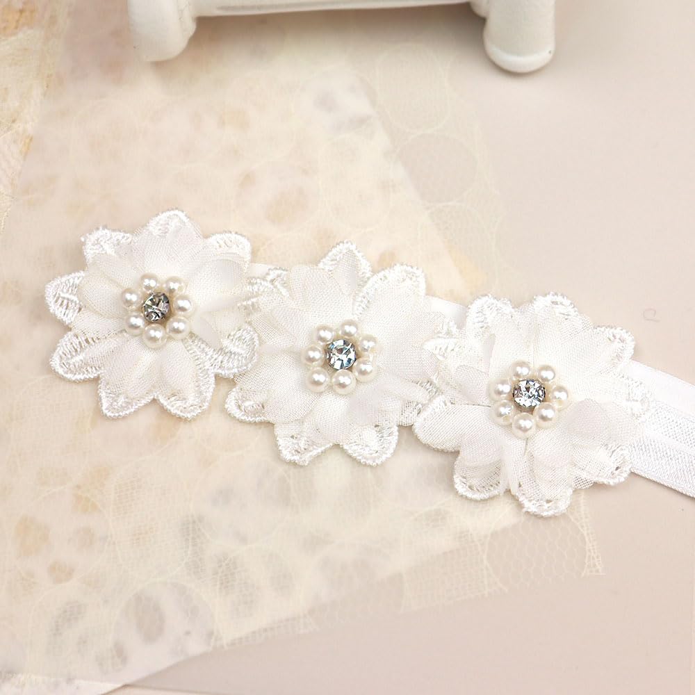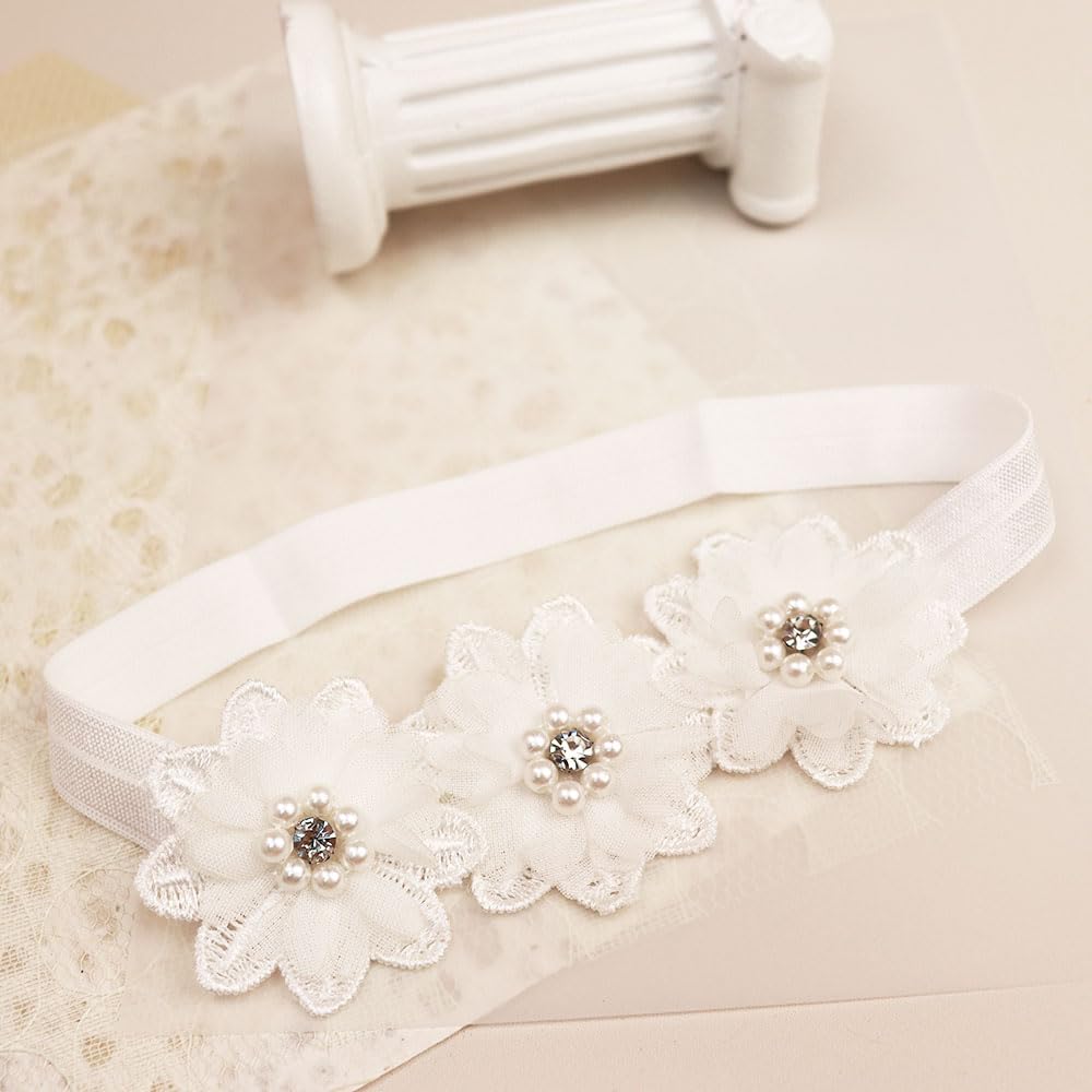 White Flower Lace Elastic Headband for Baby Girls Floral Baptism Christening Toddler Hairband Infant Flower Pearl Birthday Party Hair Accessory for Newborn Girl (White)