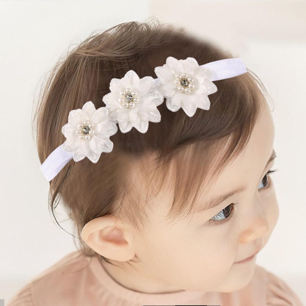 Item– White lace flower pearl elastic hairband for baby girls (1 pcs)