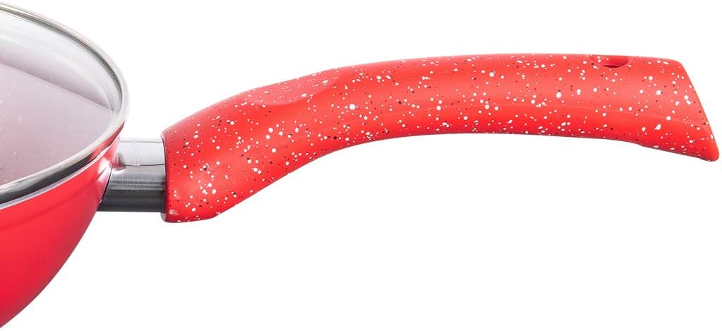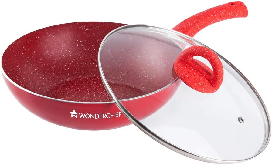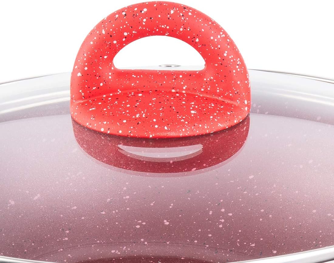 WONDERCHEF Granite Aluminium Non-stick Wok With Glass Lid, 24cm, 2.7L, 3.5mm, Red, Compatible On Hot Plate, Hobs, Gas Stove, Ceramic Plate And Induction, 2 Years Warranty