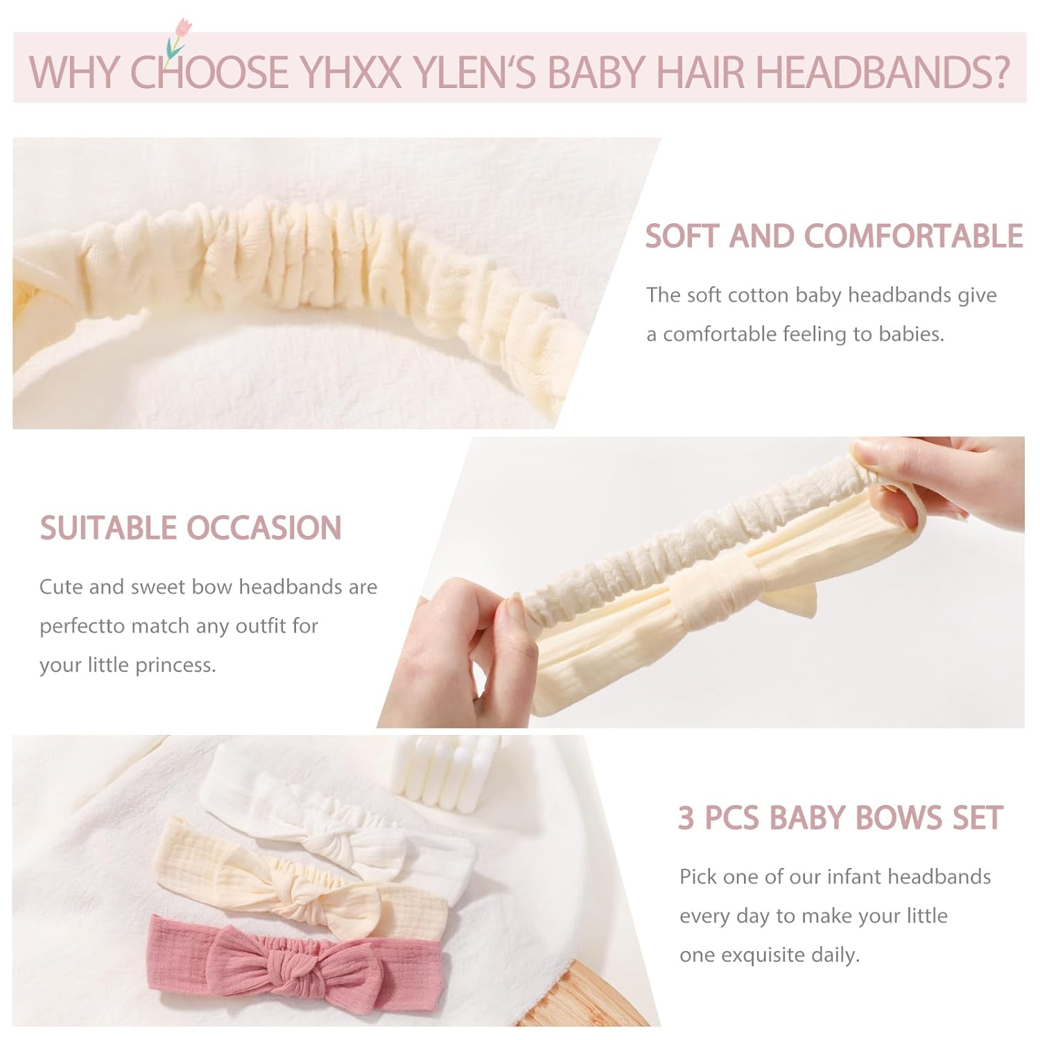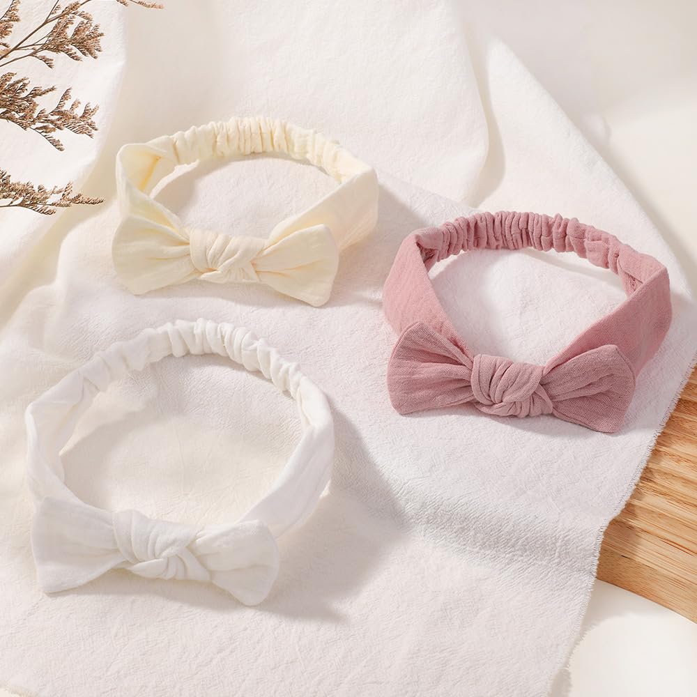 YHXX YLEN 3PCS Baby Headbands Handmade Baby Girl Headbands with Bows Soft Stretchy Hair Bands Newborn Bow Headbands for Baby Girls Infant Toddlers- Beige White Pink