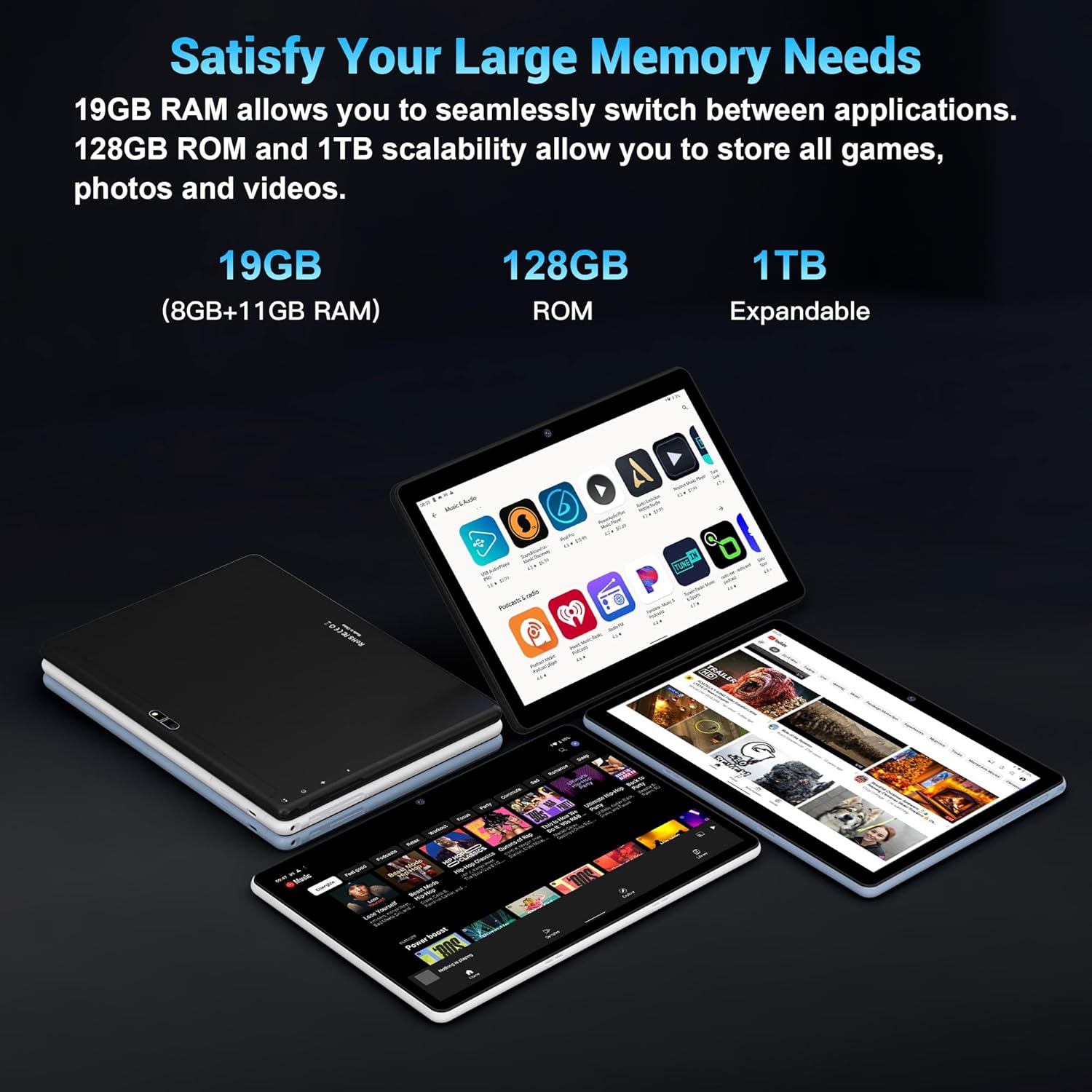 【Android 13 OS & Powerful Performance】YUMKEM Z10 tablet runs on Android 13, offering customizable interface options. With 19GB RAM, 128GB ROM (expandable to 1TB), and a 2.0GHz processor, it ensures smooth gaming, office work, and audio tasks.