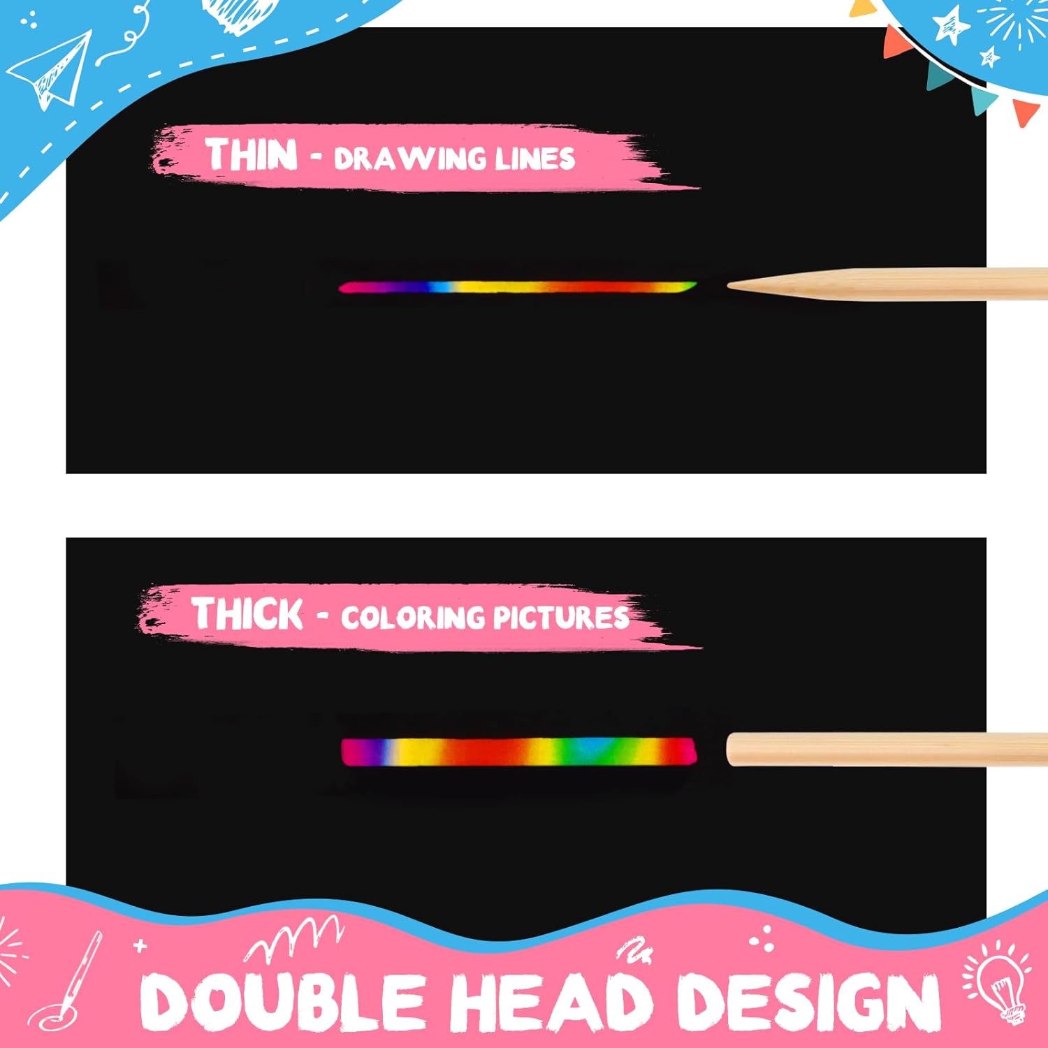 Great for Scratch Art: Scratch paper stylus work incredibly well with the scratch pads, extra sticks are so helpful with scratch art paper. Double head design: thin head is perfect for drawing lines and outlining details and thick head is suitable for coloring pictures and large area painting, easy to scratch