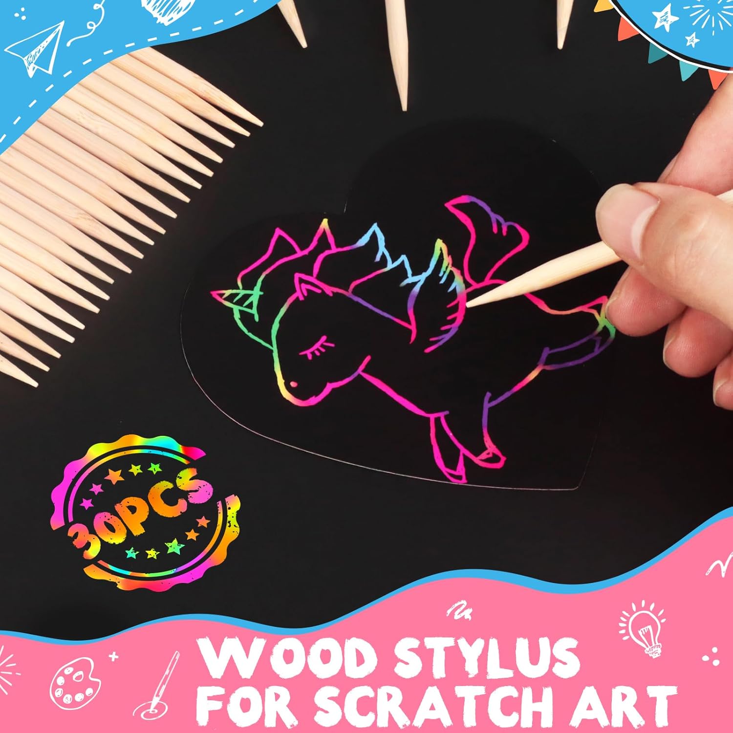 What You Get: Here comes with 30 packs scratch art stylus, size: 5.5 inch X 0.2 inch – great length for kids, perfectly using these to scratch away/draw with. It’s unique gift for boys and girls, promotes kids learning,creativity and hands-on ability